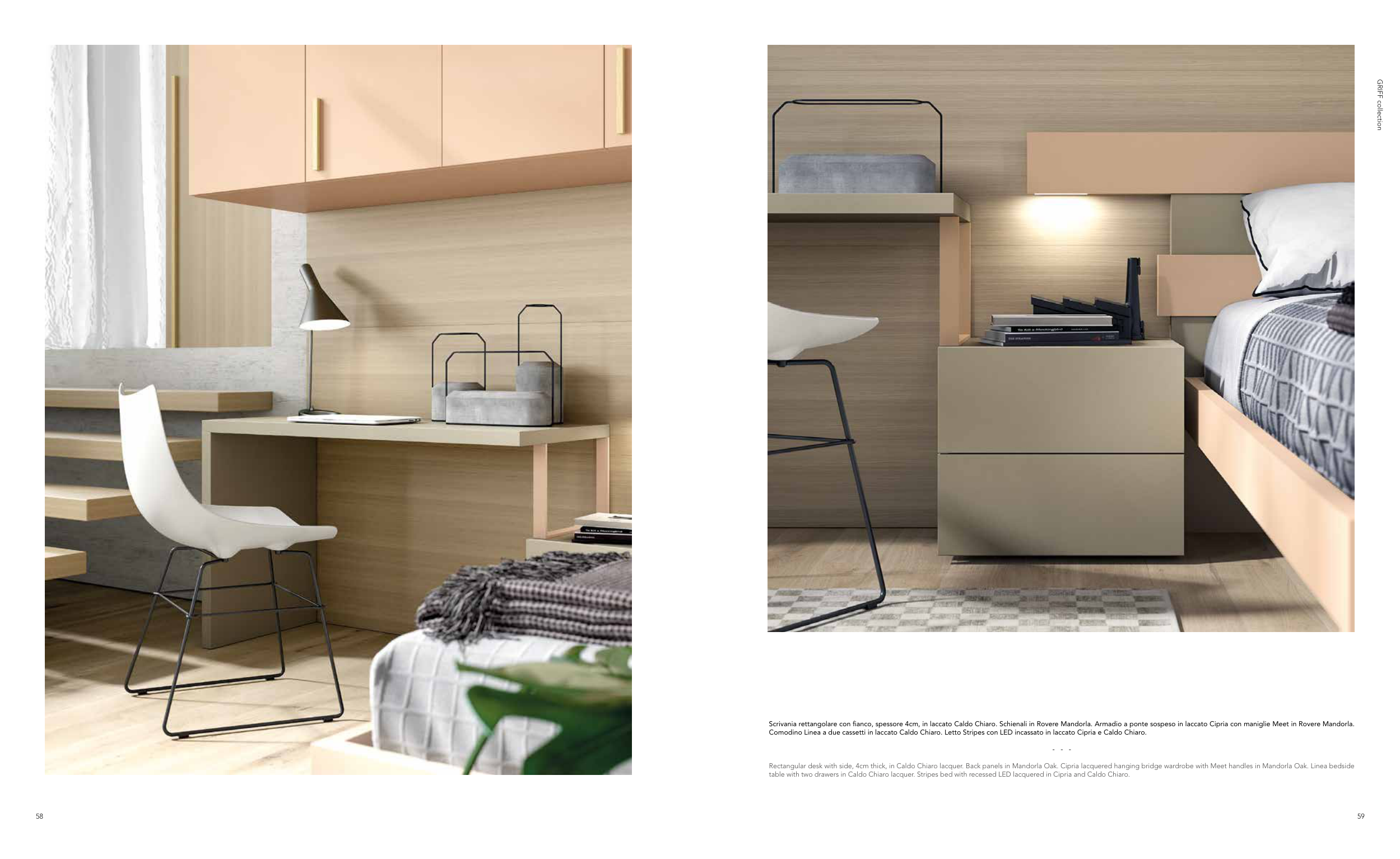 Rectangular desk with side, 4cm thick, in Caldo Chiaro lacquer. Back panels in Mandorla Oak. Cipria lacquered hanging bridge wardrobe with Meet handles in Mandorla Oak. Linea bedside