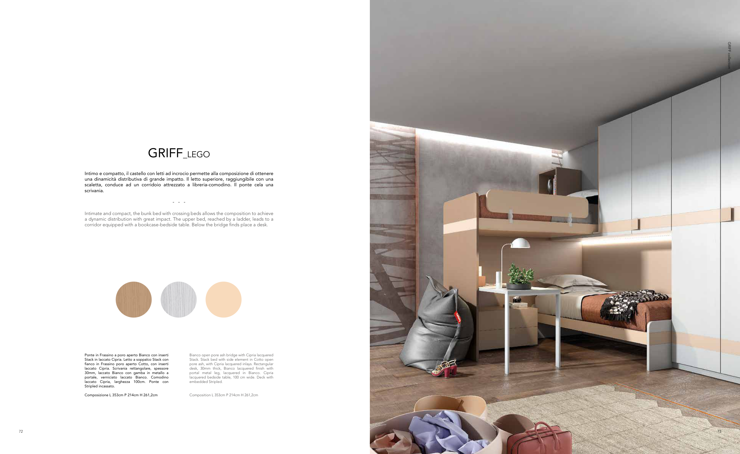 Intimate and compact, the bunk bed with crossing beds allows the composition to achieve