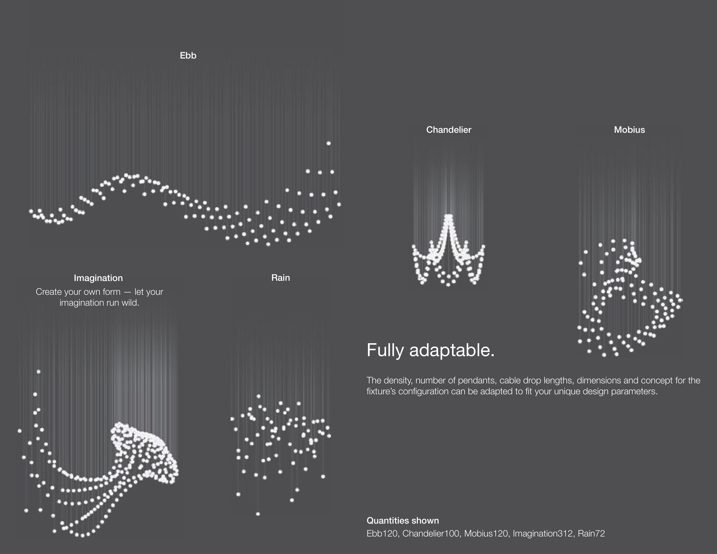 Ebb120, Chandelier100, Mobius120, Imagination312, Rain72