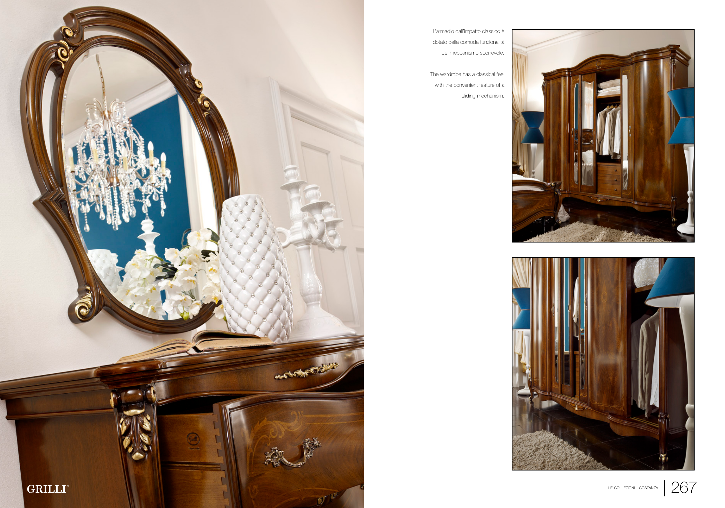 le collezioni | costanza | 267 L’armadio dall’impatto classico è dotato della comoda funzionalità del meccanismo scorrevole. The wardrobe has a classical feel with the convenient feature of a sliding mechanism.