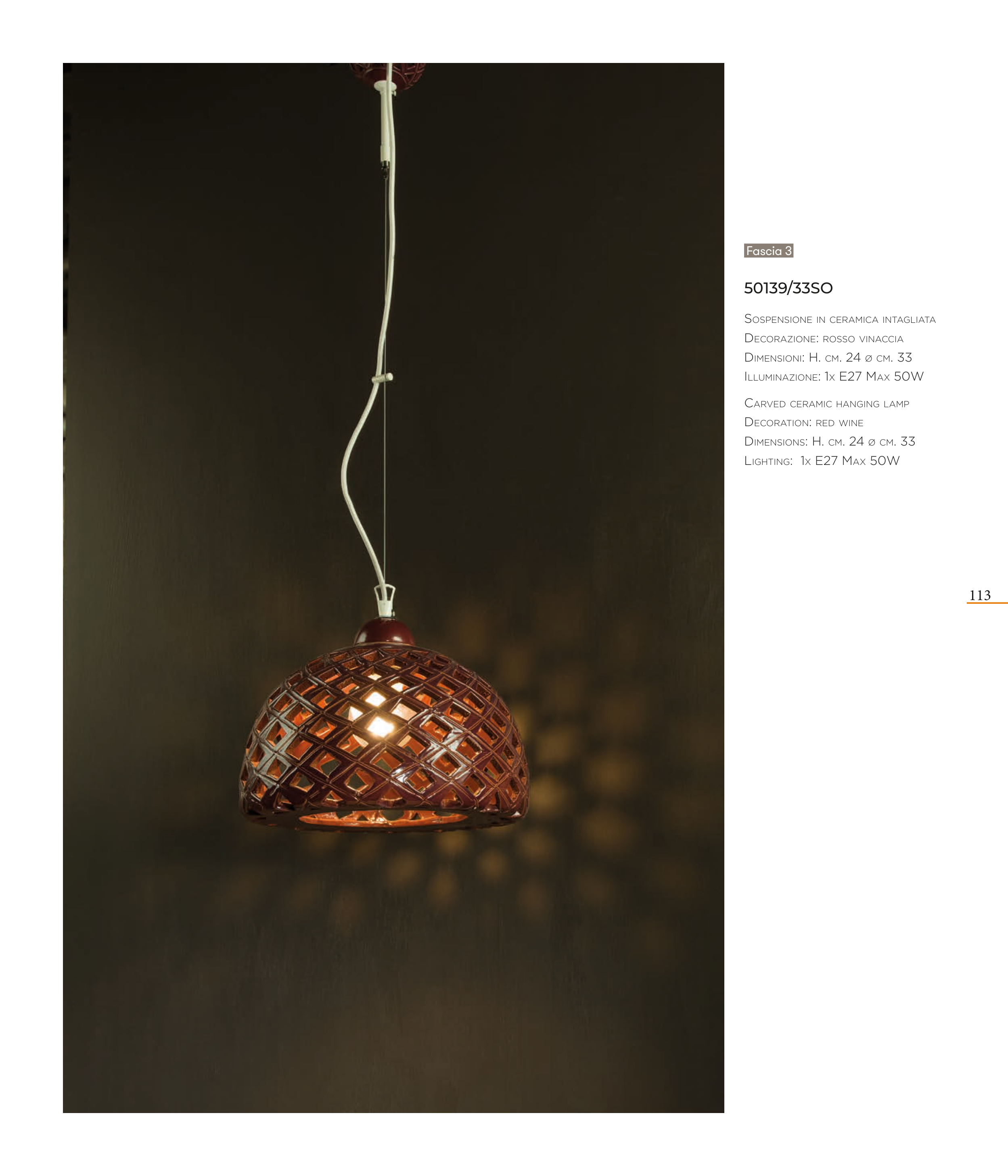 113 50139/33SO SOSPENSIONE IN CERAMICA INTAGLIATA DECORAZIONE: ROSSO VINACCIA DIMENSIONI: H. CM. 24 Ø CM. 33 ILLUMINAZIONE: 1X E27 MAX 50W CARVED CERAMIC HANGING LAMP DECORATION: RED WINE DIMENSIONS: H. CM. 24 Ø CM. 33 LIGHTING: 1X E27 MAX 50W Fascia 3