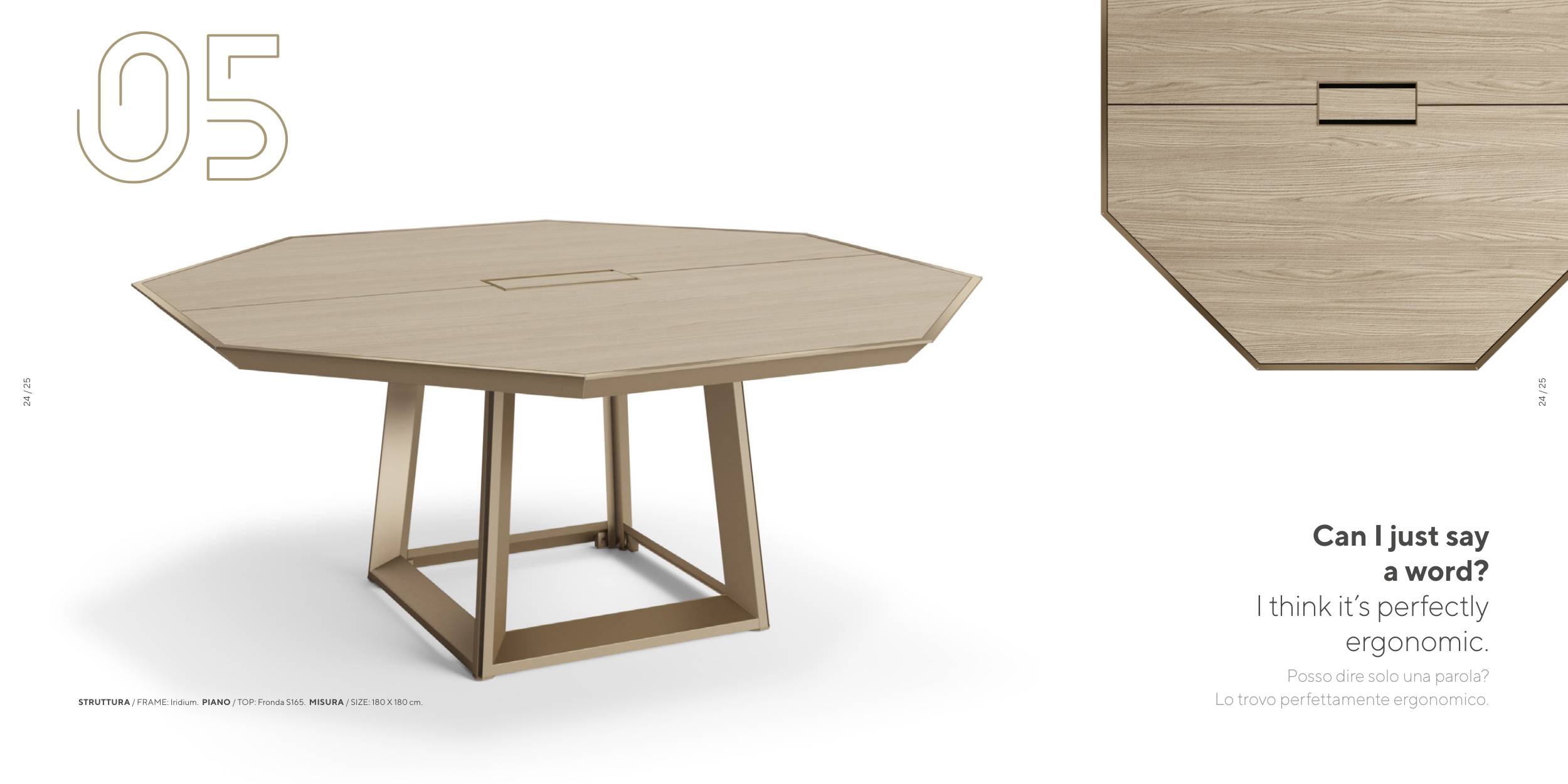 24 / 25 24 / 25 05 STRUTTURA / FRAME: Iridium. PIANO / TOP: Fronda S165. MISURA / SIZE: 180 X 180 cm. Can I just say a word? I think it’s perfectly ergonomic. Posso dire solo una parola? Lo trovo perfettamente ergonomico.