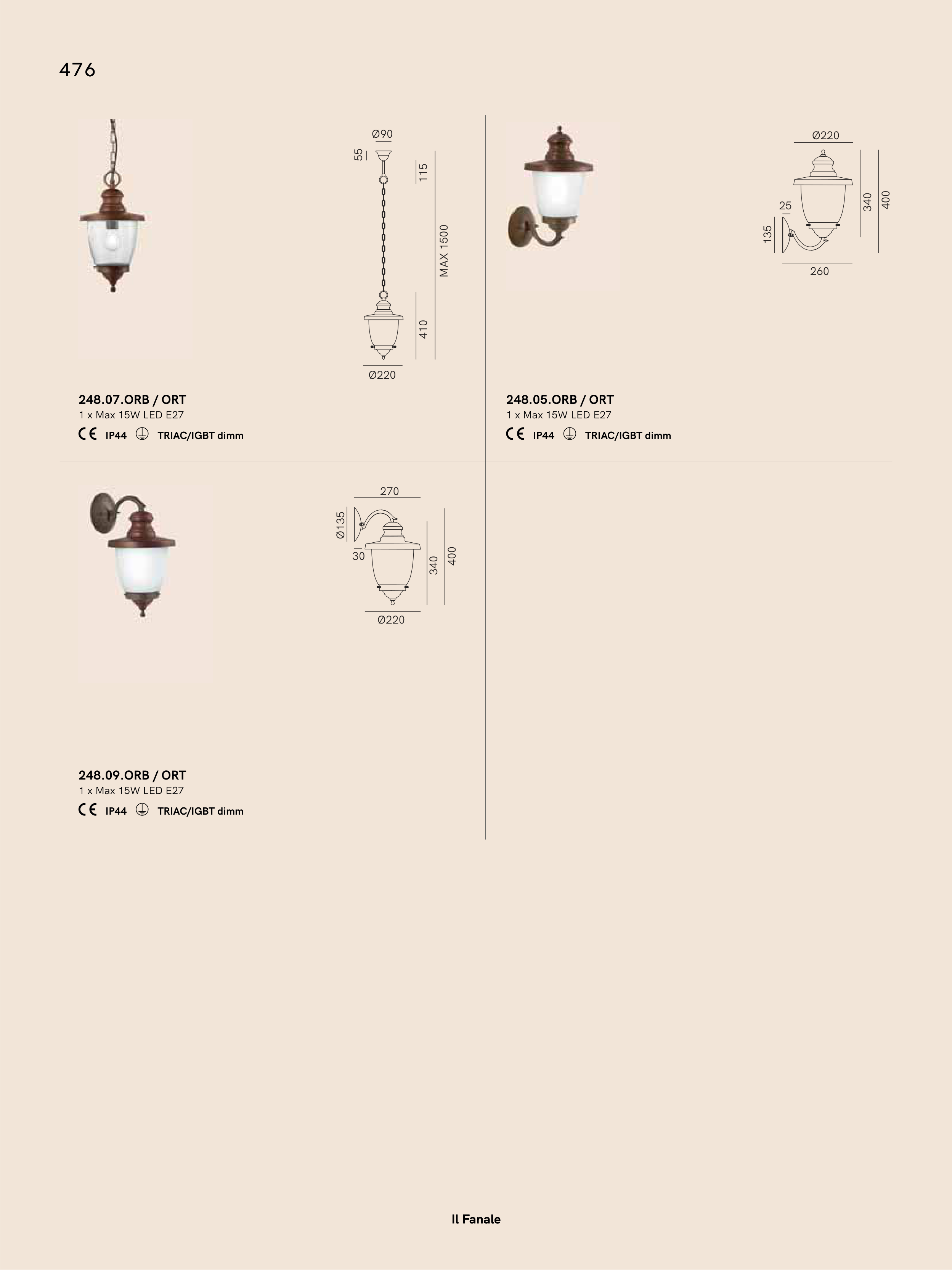 248.09.ORB / ORT 1 x Max 15W LED E27 248.05.ORB / ORT 1 x Max 15W LED E27 248.07.ORB / ORT 1 x Max 15W LED E27 Ø90 Ø220 55 115 MAX 1500 410 260 Ø220 135 340 400 25 Ø135 30 340 400 Ø220 270 IP44 IP44 IP44 TRIAC/IGBT dimm TRIAC/IGBT dimm TRIAC/IGBT dimm Il Fanale 476 Il Fanale 476