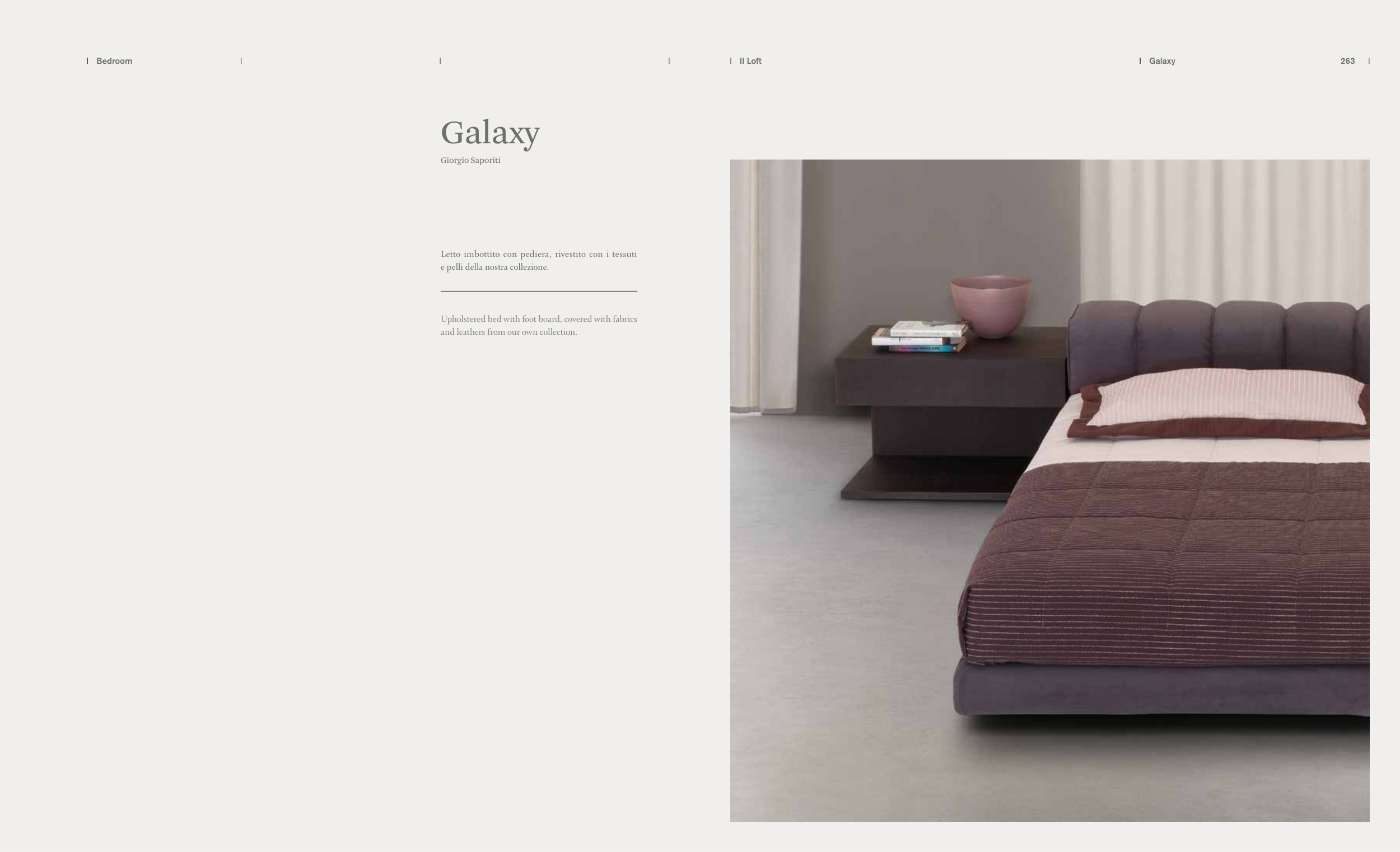 Letto imbottito con pediera, rivestito con i tessuti e pelli della nostra collezione. Upholstered bed with foot board, covered with fabrics and leathers from our own collection. Il Loft 263 Galaxy Giorgio Saporiti Bedroom Galaxy