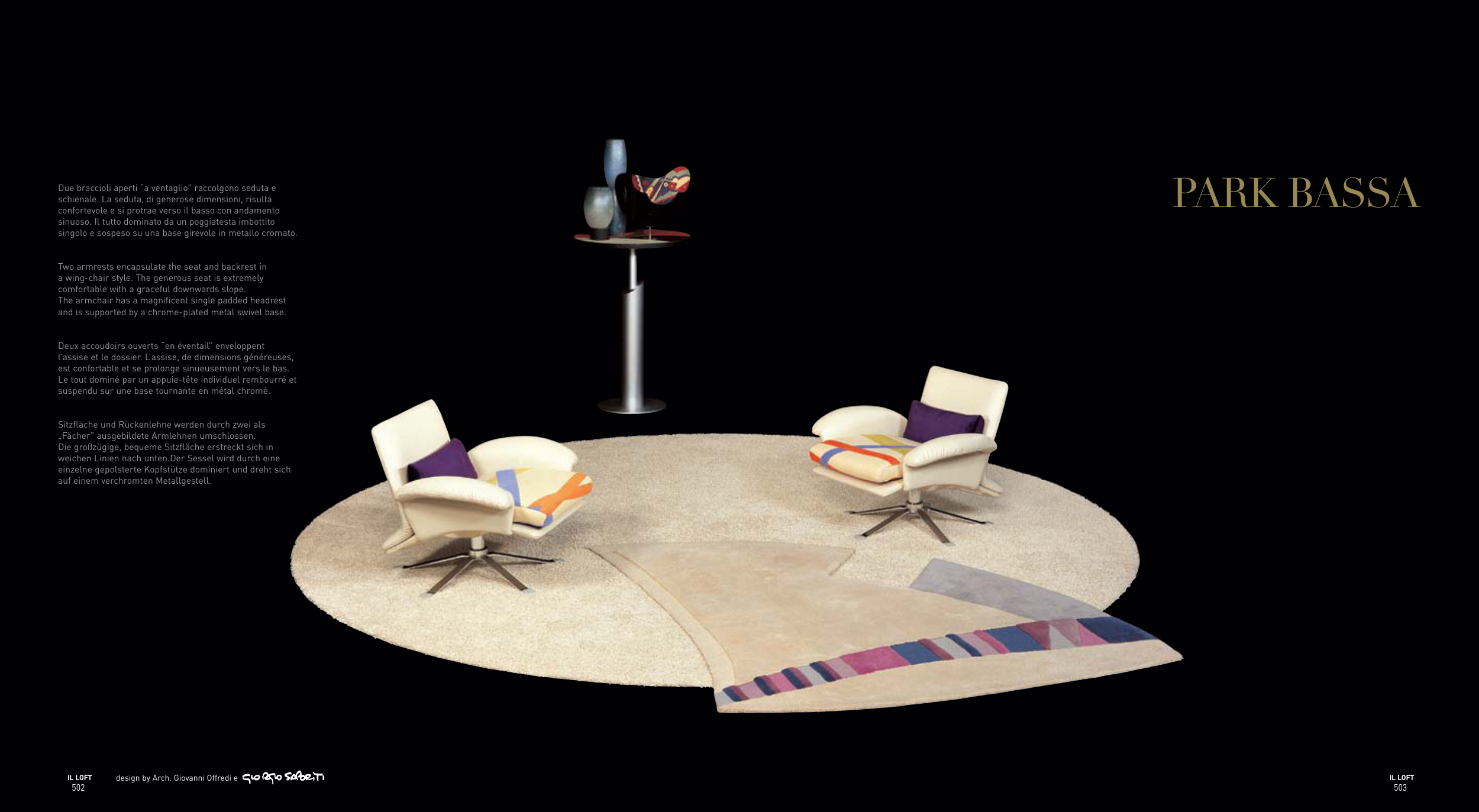 Due braccioli aperti “a ventaglio” raccolgono seduta e