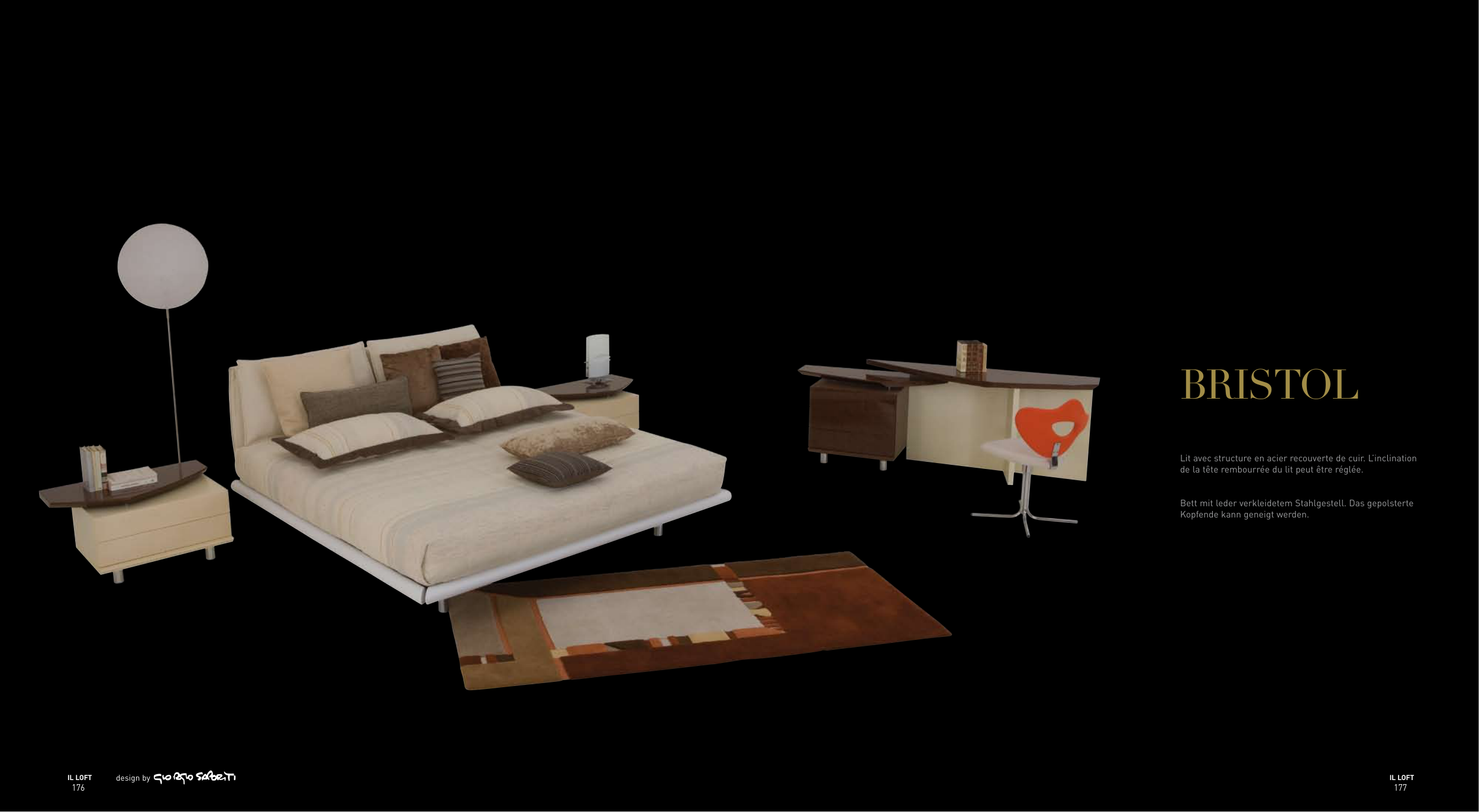 BRISTOL design by IL LOFT 177 IL LOFT 176 Lit avec structure en acier recouverte de cuir. L’inclination de la tête rembourrée du lit peut être réglée. Bett mit leder verkleidetem stahlgestell. das gepolsterte Kopfende kann geneigt werden.