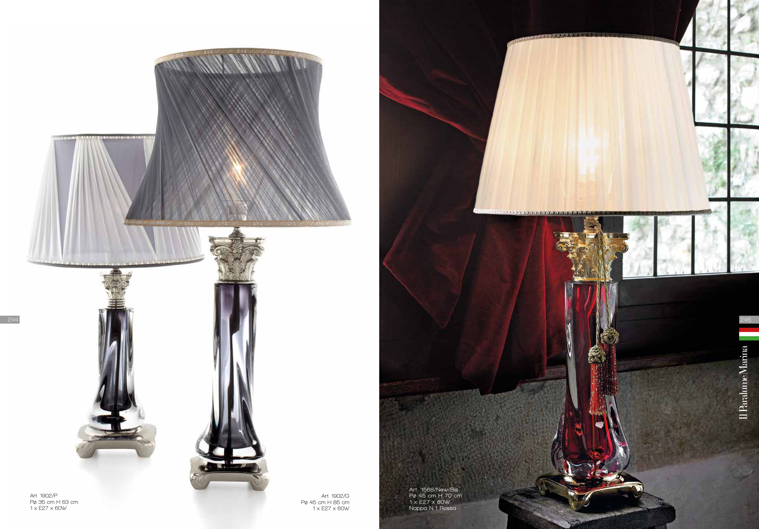 Art. 1902/G Pø 45 cm H 85 cm 1 x E27 x 60W Art. 1902/P Pø 35 cm H 63 cm 1 x E27 x 60W Art. 1568/New/Bis Pø 45 cm H 70 cm 1 x E27 x 60W Nappa N.1 Rossa 245 244