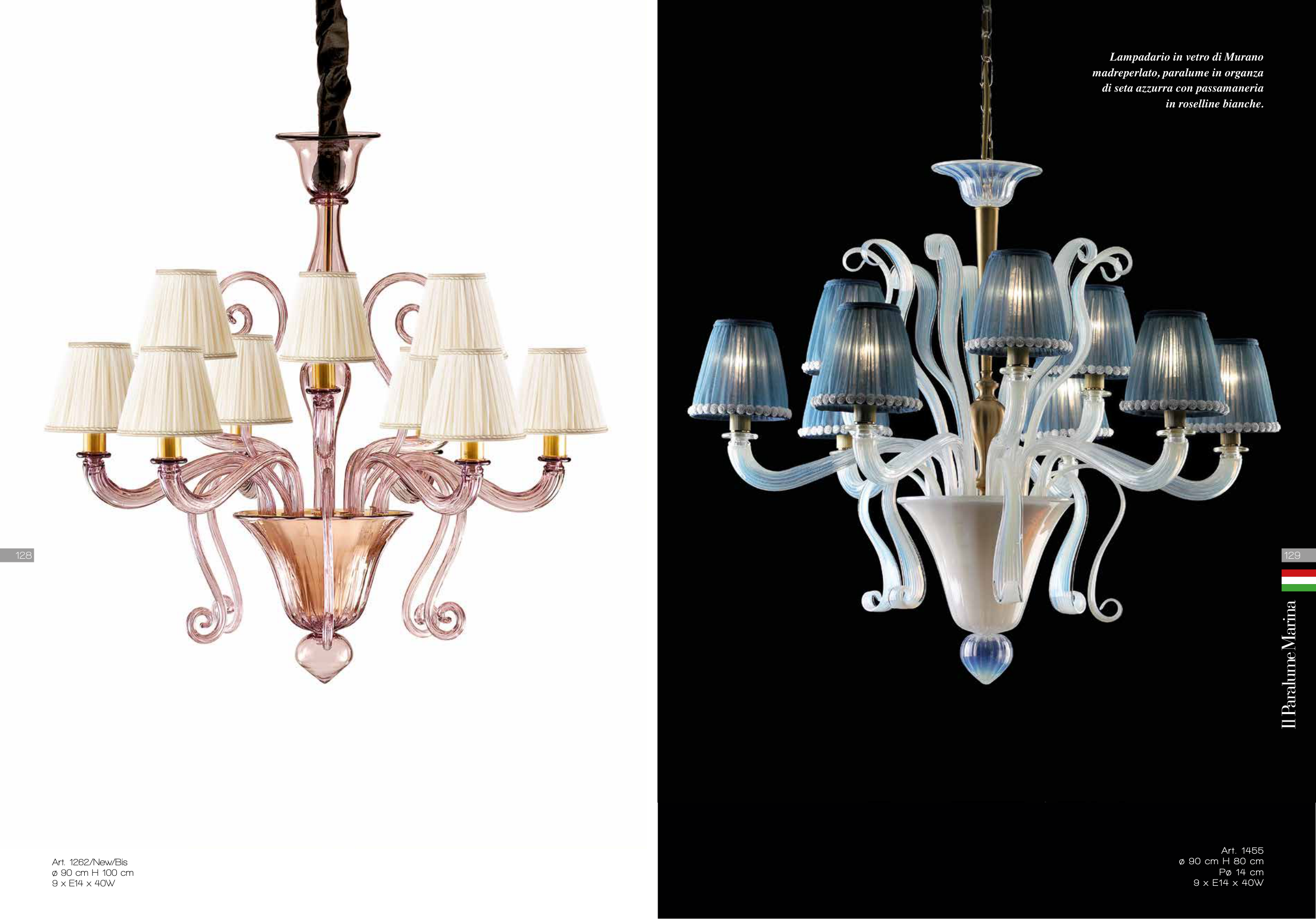 Lampadario in vetro di Murano madreperlato, paralume in organza di seta azzurra con passamaneria in roselline bianche. Art. 1455 ø 90 cm H 80 cm Pø 14 cm 9 x E14 x 40W Art. 1262/New/Bis ø 90 cm H 100 cm 9 x E14 x 40W 129 128
