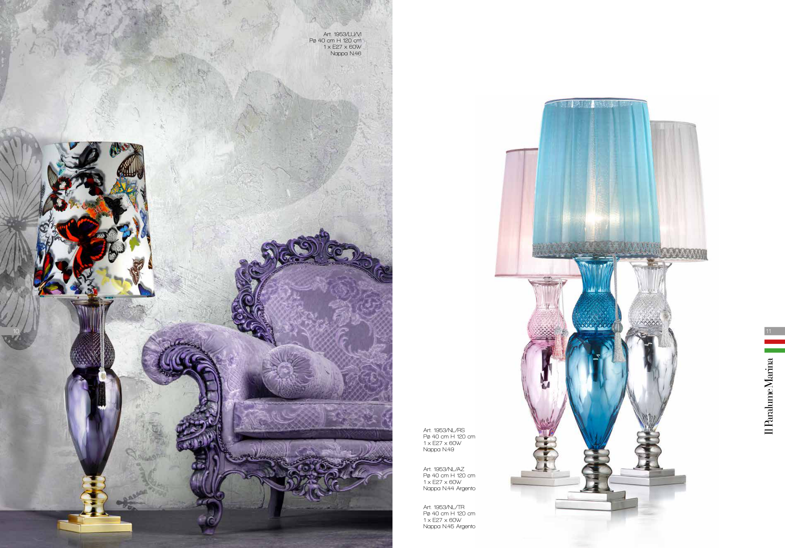 Art. 1953/NL/AZ Pø 40 cm H 120 cm 1 x E27 x 60W Nappa N.44 Argento Art. 1953/NL/RS Pø 40 cm H 120 cm 1 x E27 x 60W Nappa N.49 Art. 1953/NL/TR Pø 40 cm H 120 cm 1 x E27 x 60W Nappa N.45 Argento Art. 1953/LU/VI Pø 40 cm H 120 cm 1 x E27 x 60W Nappa N.46 11 10