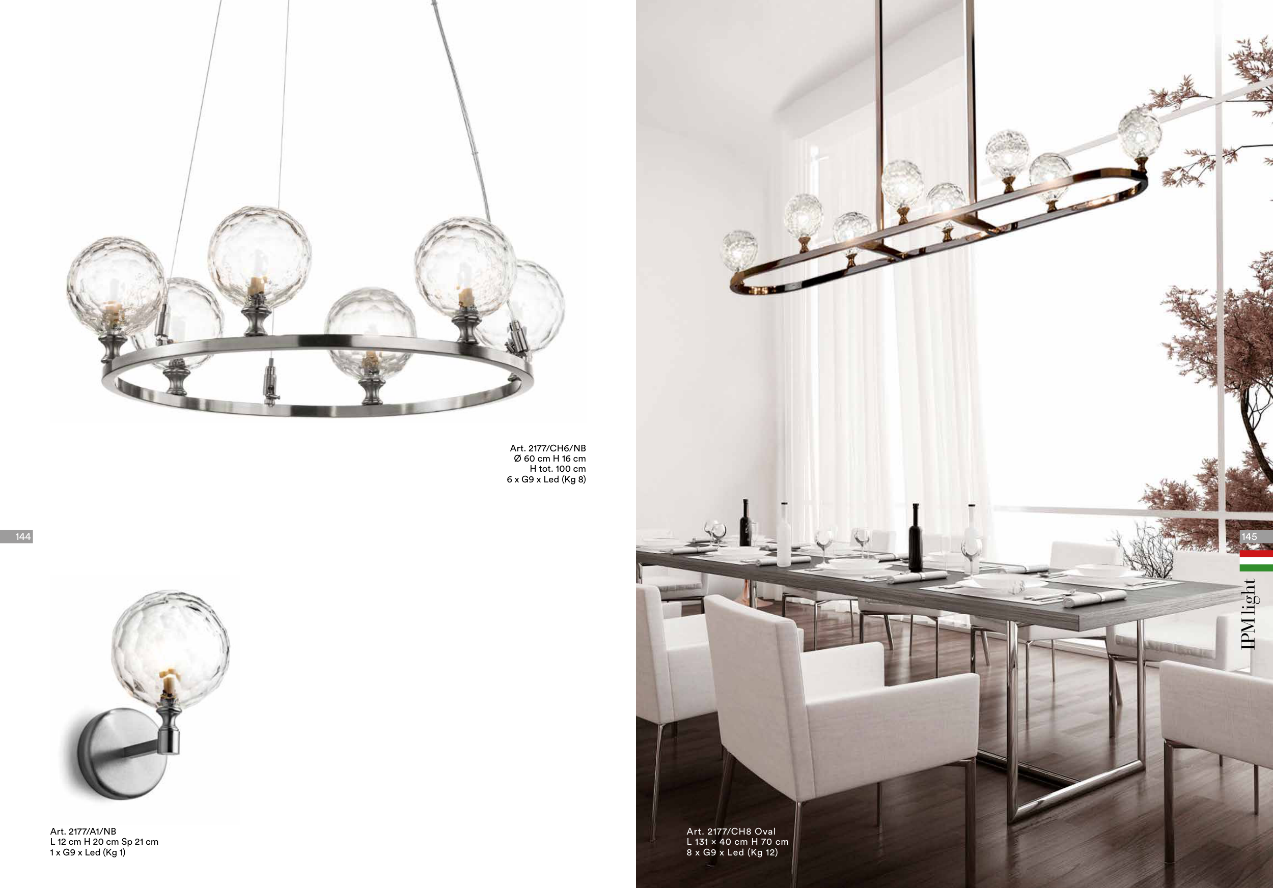 Art. 2177/A1/NB L 12 cm H 20 cm Sp 21 cm 1 x G9 x Led (Kg 1) Art. 2177/CH6/NB Ø 60 cm H 16 cm H tot. 100 cm 6 x G9 x Led (Kg 8) Art. 2177/CH8 Oval L 131 x 40 cm H 70 cm 8 x G9 x Led (Kg 12) 145 144