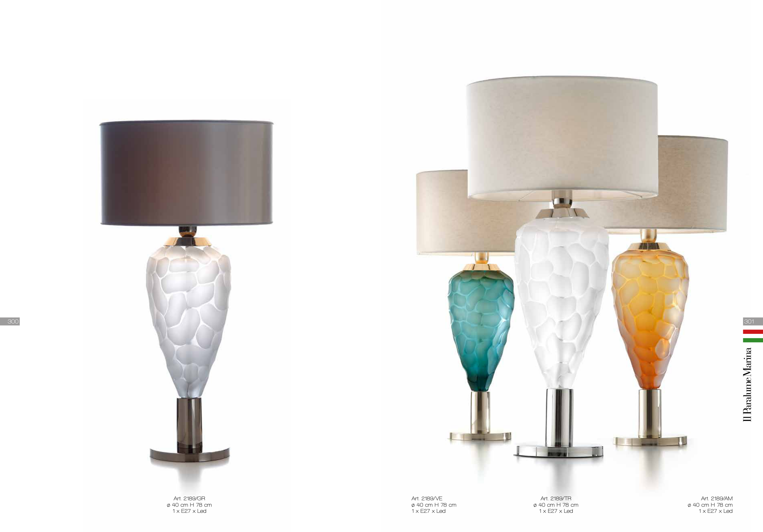 Art. 2189/TR ø 40 cm H 78 cm 1 x E27 x Led Art. 2189/AM ø 40 cm H 78 cm 1 x E27 x Led Art. 2189/VE ø 40 cm H 78 cm 1 x E27 x Led Art. 2189/GR ø 40 cm H 78 cm 1 x E27 x Led 301 300