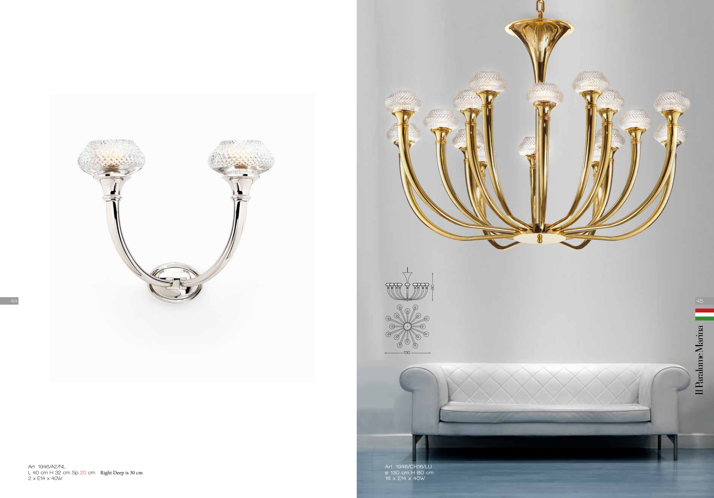Art. 1946/A2/NL L 40 cm H 32 cm Sp 20 cm 2 x E14 x 40W Art. 1946/CH16/LU ø 130 cm H 80 cm 16 x E14 x 40W 14 39 64 ø10 100 130 80 80 55 34 19 24 34 45 44 Right Deep is 30 cm
