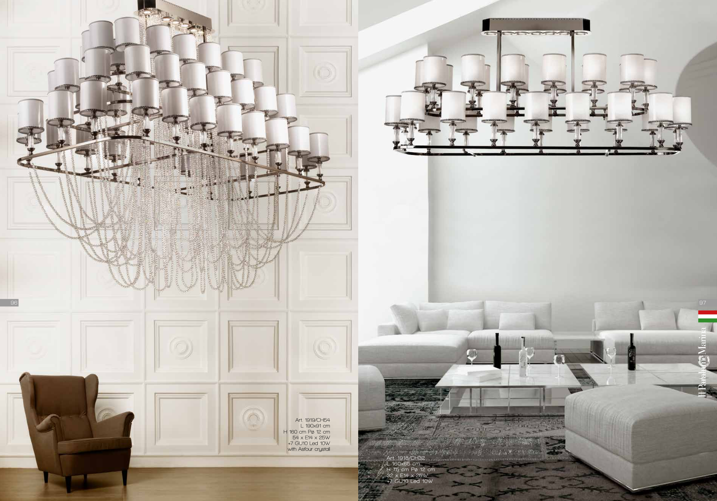 Art. 1919/CH54 L 190x91 cm H 160 cm Pø 12 cm 54 x E14 x 25W +7 GU10 Led 10W with Asfour crystall Art. 1918/CH32 L 160x65 cm H 75 cm Pø 12 cm 32 x E14 x 25W +7 GU10 Led 10W 97 96