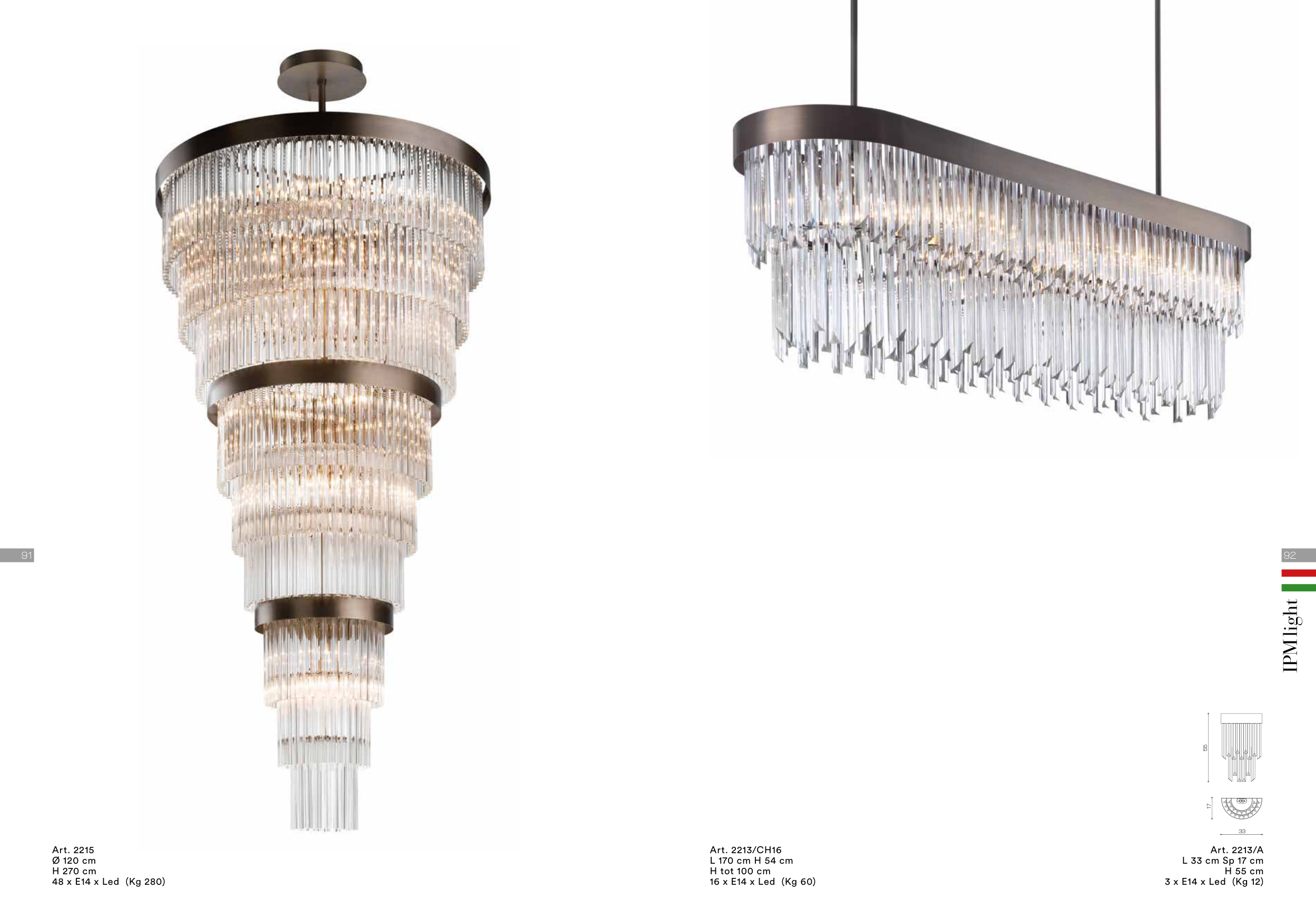 Art. 2213/CH16 L 170 cm H 54 cm H tot 100 cm 16 x E14 x Led (Kg 60) Art. 2213/A L 33 cm Sp 17 cm H 55 cm 3 x E14 x Led (Kg 12) Art. 2215 Ø 120 cm H 270 cm 48 x E14 x Led (Kg 280) 33 55 17 92 91