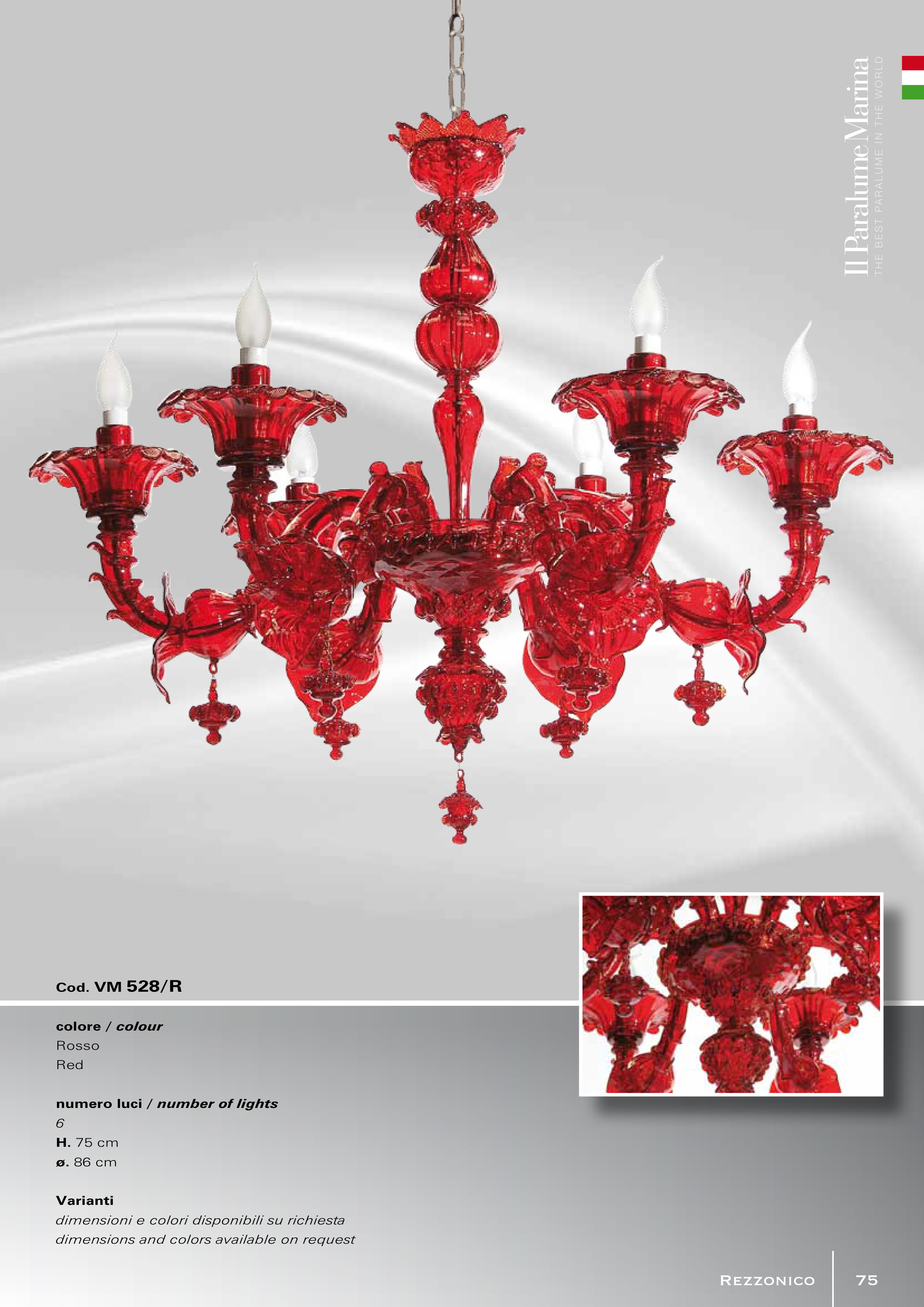 Cod. VM 528/R colore / colour Rosso Red numero luci / number of lights 6 H. 75 cm ø. 86 cm Varianti dimensioni e colori disponibili su richiesta dimensions and colors available on request Rezzonico 75