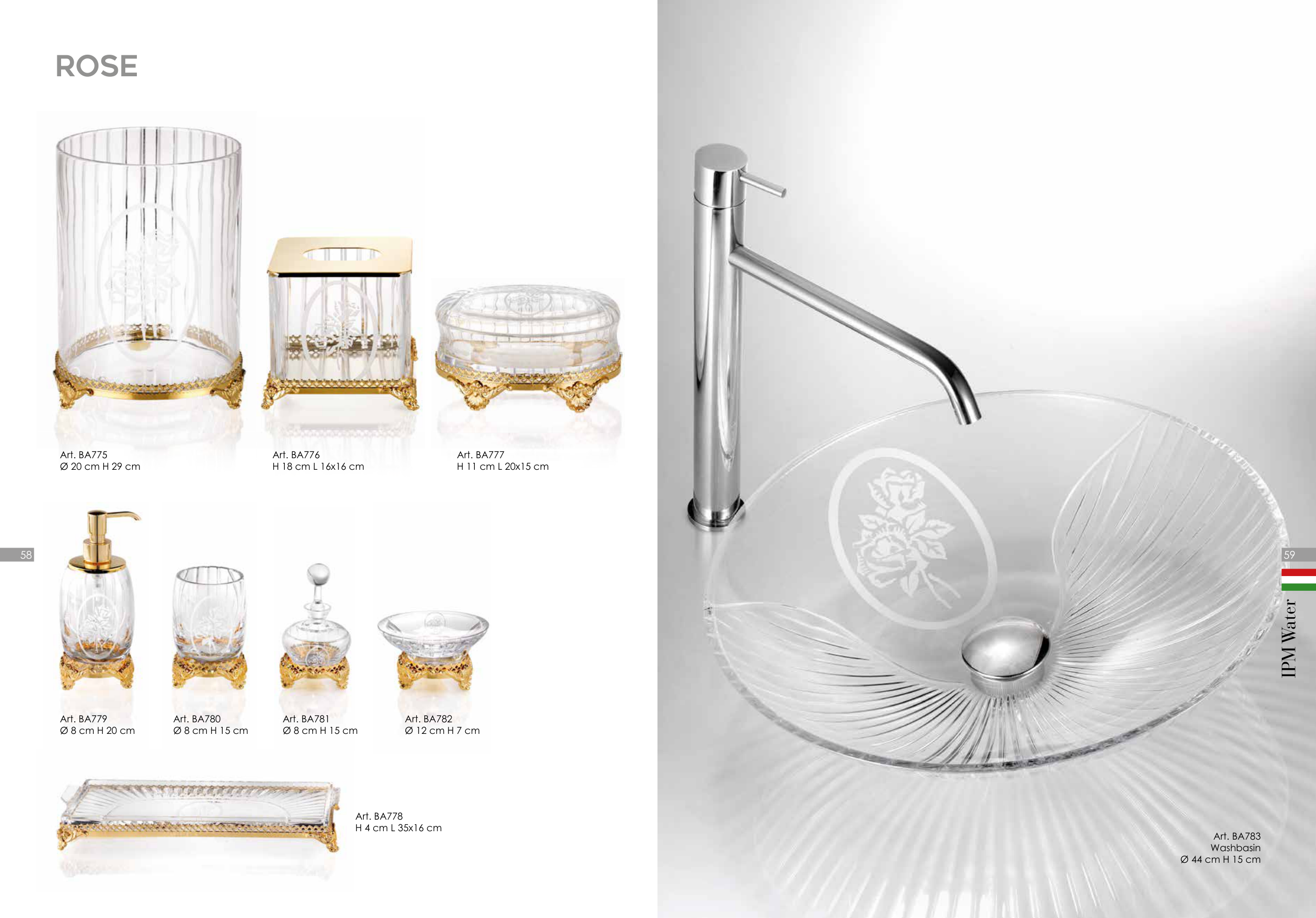 Art. BA783 Washbasin Ø 44 cm H 15 cm Rose Art. BA775 Ø 20 cm H 29 cm Art. BA776 H 18 cm L 16x16 cm Art. BA777 H 11 cm L 20x15 cm Art. BA779 Ø 8 cm H 20 cm Art. BA780 Ø 8 cm H 15 cm Art. BA781 Ø 8 cm H 15 cm Art. BA782 Ø 12 cm H 7 cm Art. BA778 H 4 cm L 35x16 cm 59 58