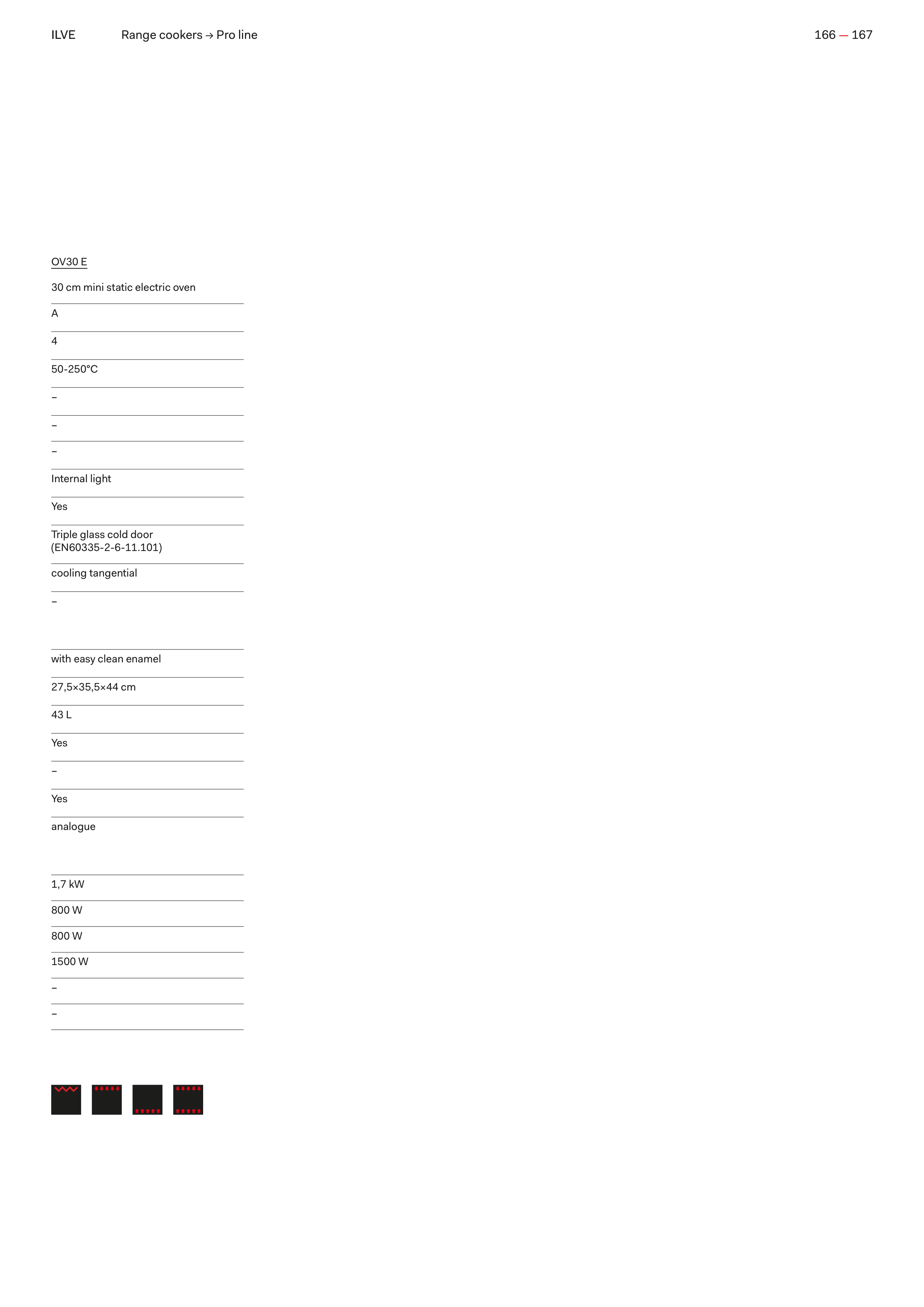 ILVE OV30 E 30 cm mini static electric oven A 4 50-250°C – – – Internal light Yes Triple glass cold door (EN60335-2-6-11.101) cooling tangential – with easy clean enamel 27,5×35,5×44 cm 43 L Yes – Yes analogue 1,7 kW 800 W 800 W 1500 W – – ILVE 166 — 167 Range cookers → Pro line