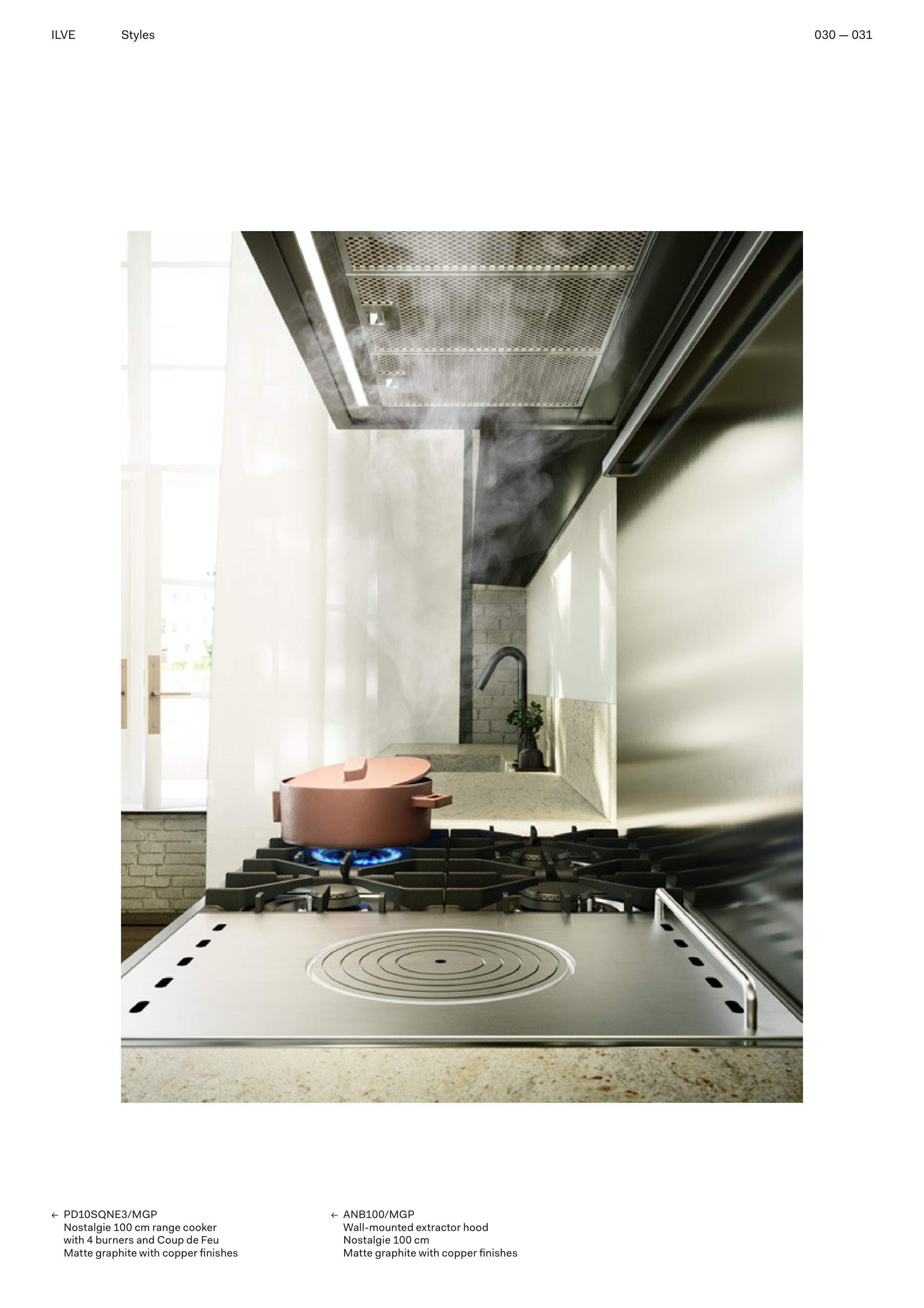 ← PD10SQNE3/MGP Nostalgie 100 cm range cooker with 4 burners and Coup de Feu Matte graphite with copper finishes ← ANB100/MGP Wall-mounted extractor hood Nostalgie 100 cm Matte graphite with copper finishes ILVE 030 — 031 Styles