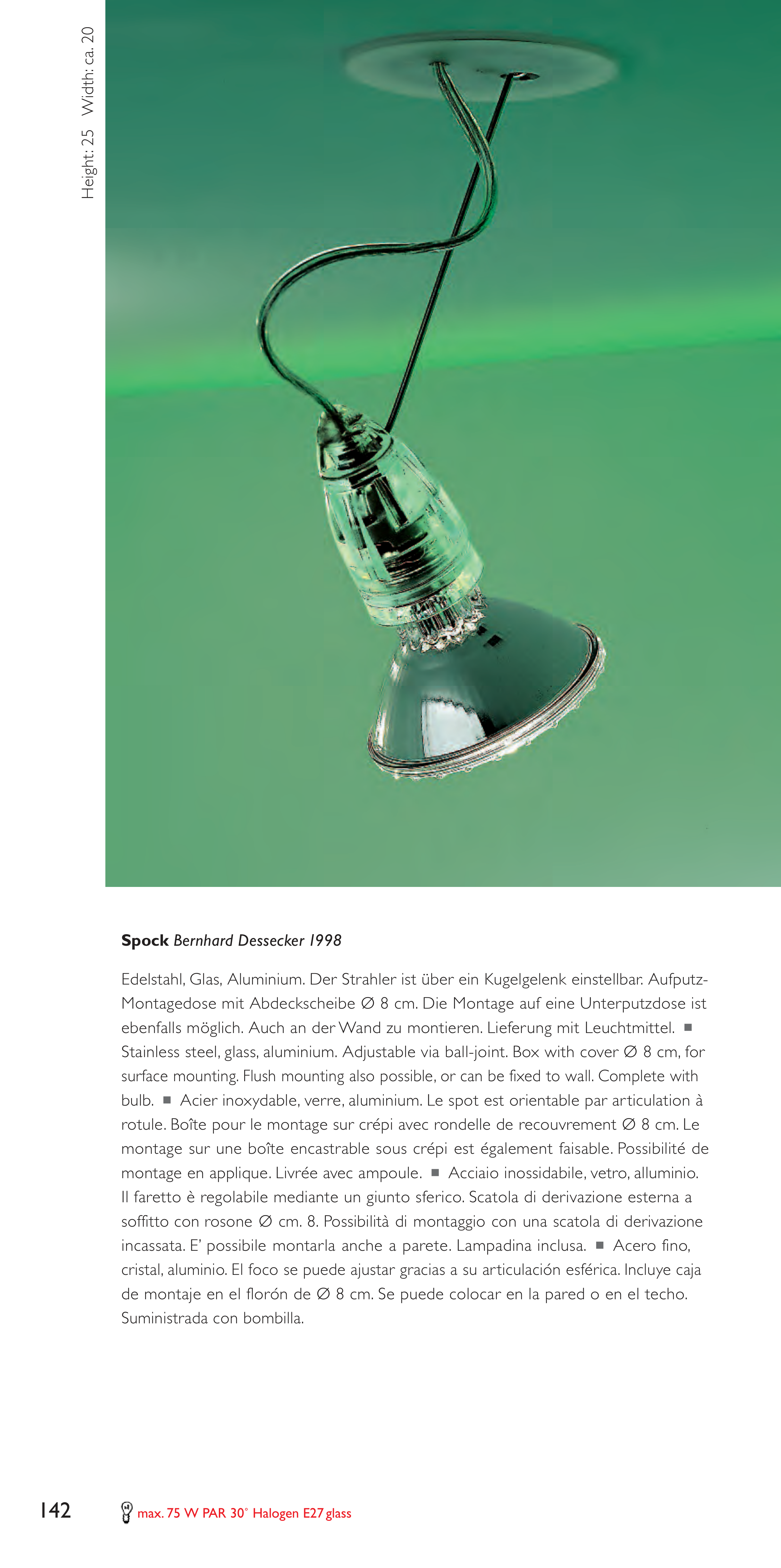 Stainless steel, glass, aluminium. Adjustable via ball-joint. Box with cover Ø 8 cm, for
