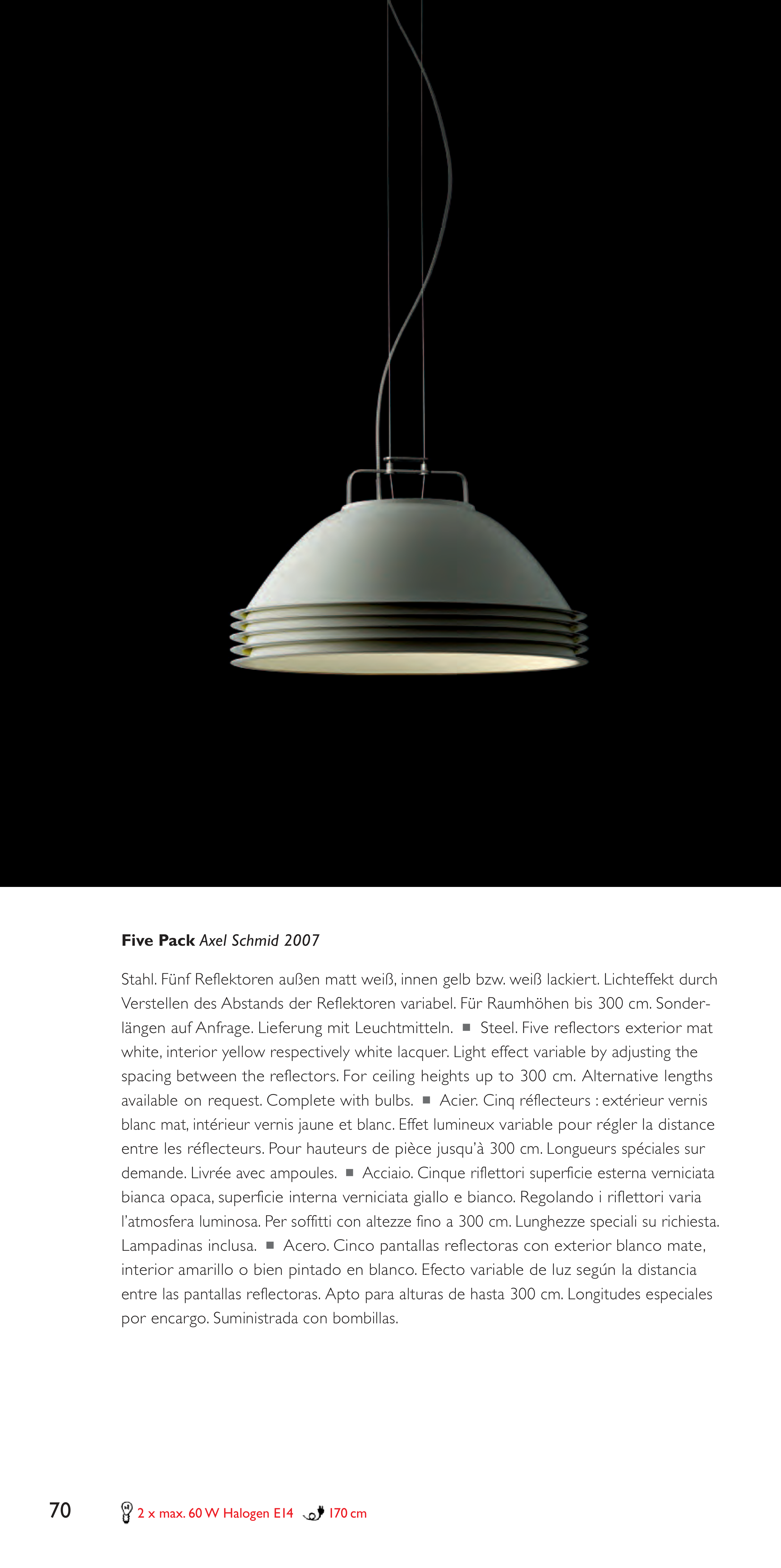 Stahl. Fünf Reflektoren außen matt weiß, innen gelb bzw. weiß lackiert. Lichteffekt durch