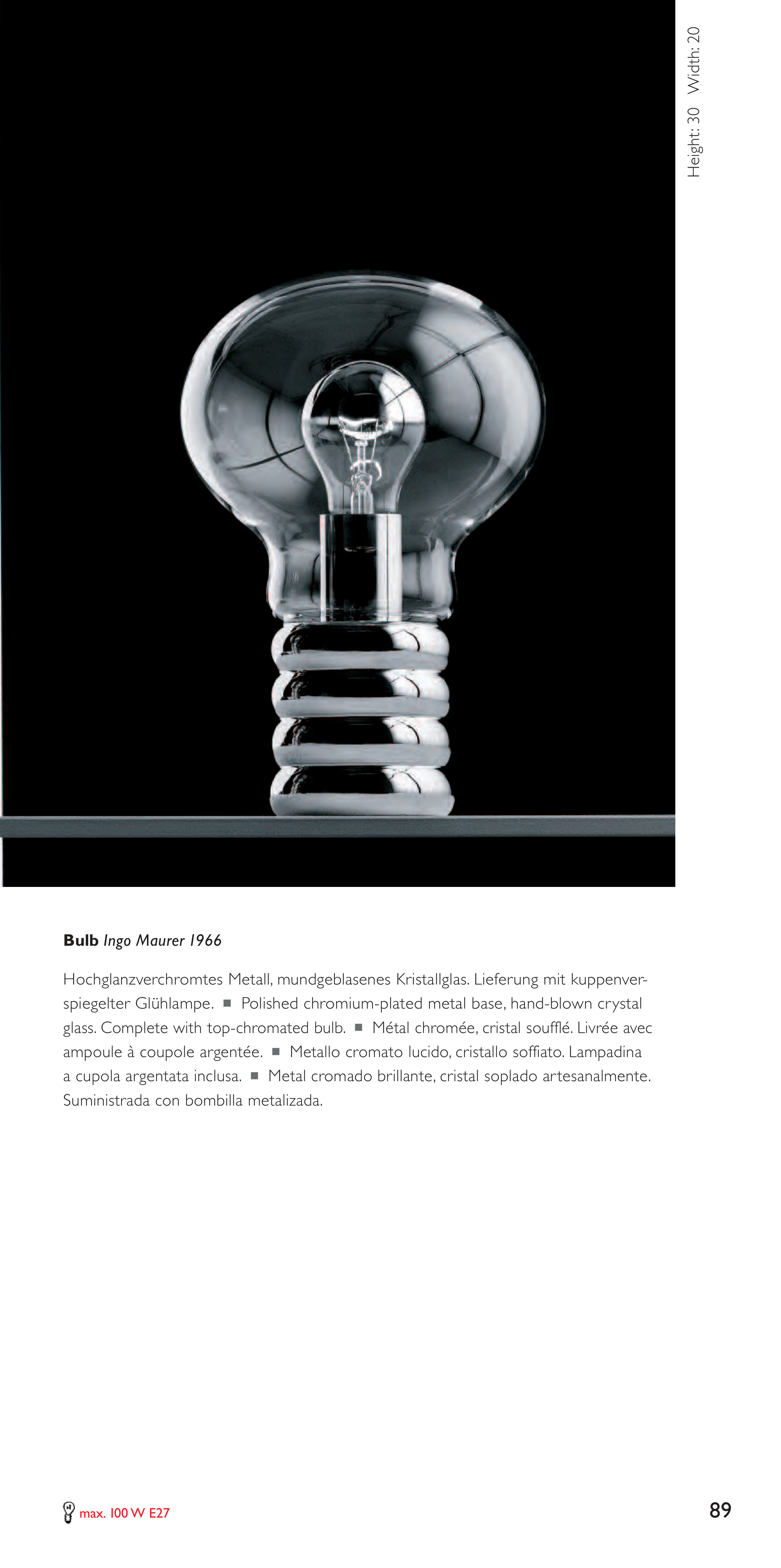 Metallo cromato lucido, cristallo soffiato. Lampadina