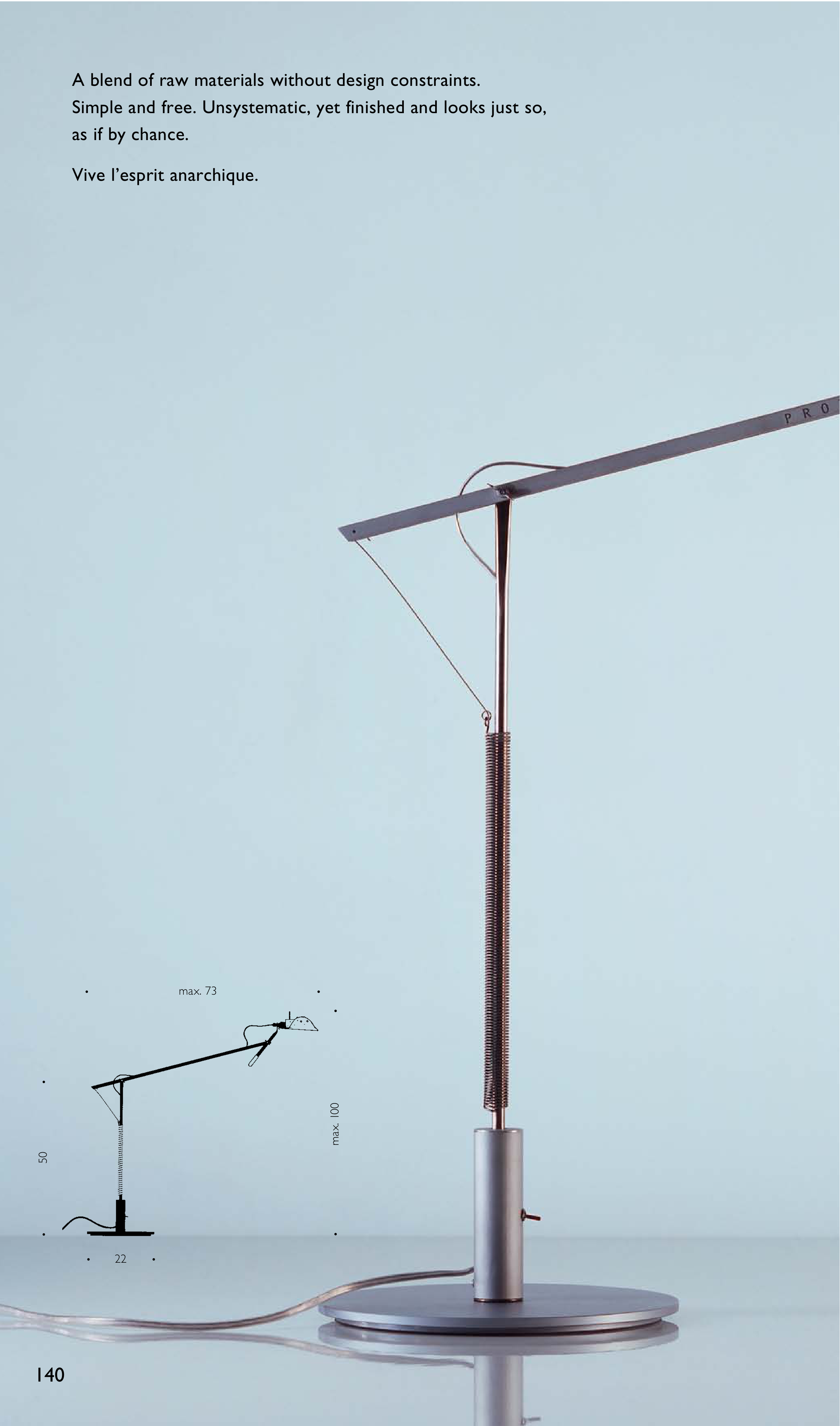 140 · 22 · · max. 73 · · max. 100 · · 50 · A blend of raw materials without design constraints. Simple and free. Unsystematic, yet finished and looks just so, as if by chance. Vive l’esprit anarchique.