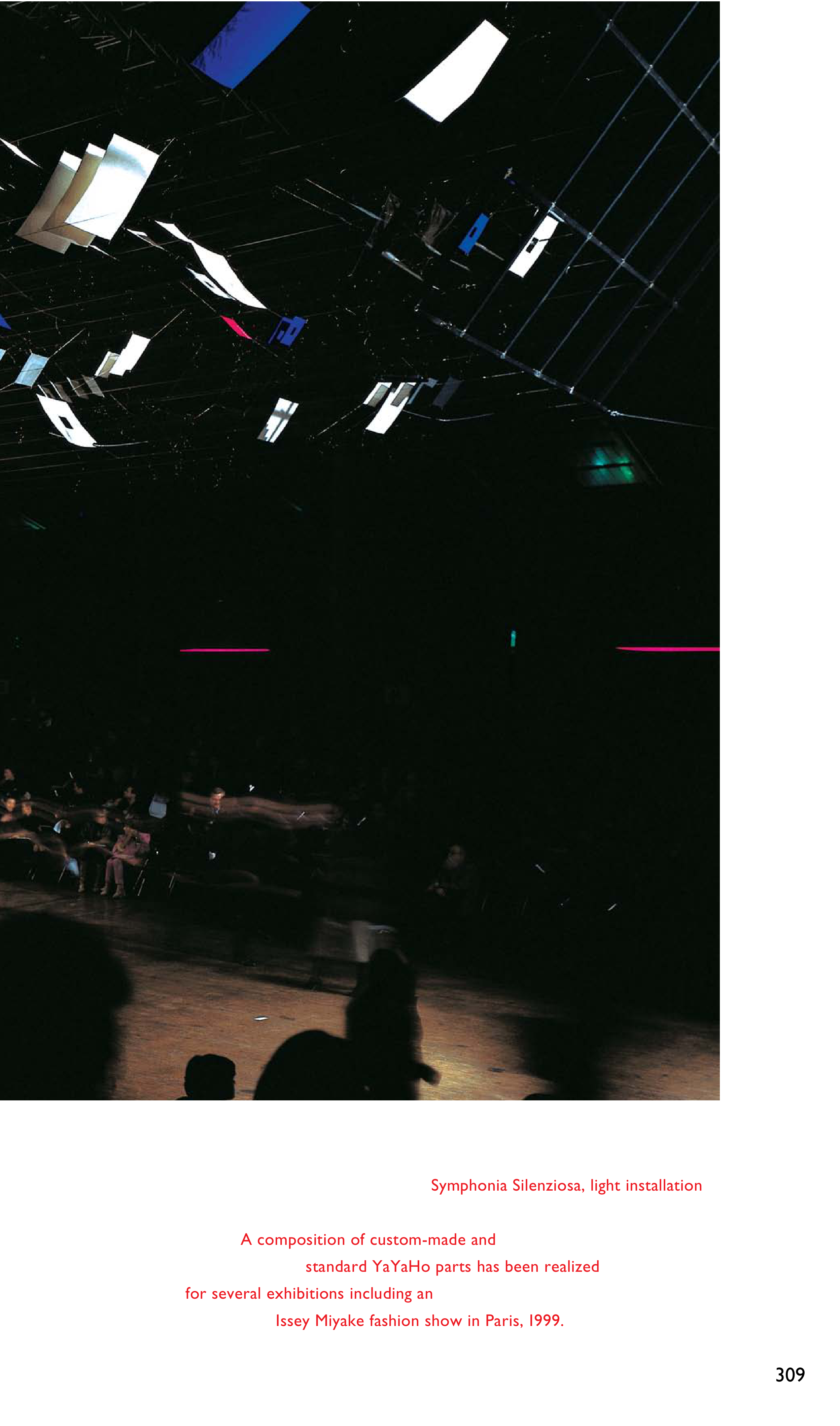 309 Symphonia Silenziosa, light installation A composition of custom-made and standard YaYaHo parts has been realized for several exhibitions including an Issey Miyake fashion show in Paris, 1999.
