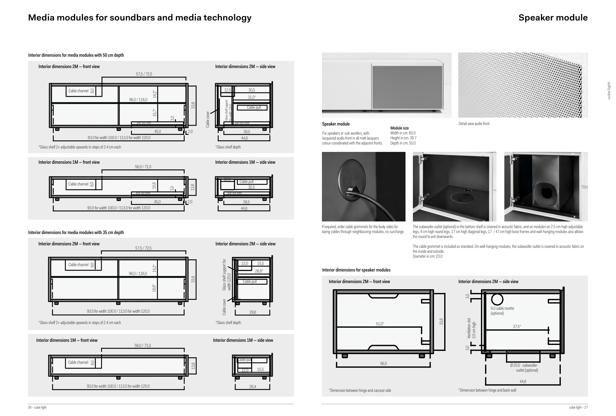 The cable grommet is included as standard. On wall-hanging modules, the subwoofer outlet is covered in acoustic fabric on