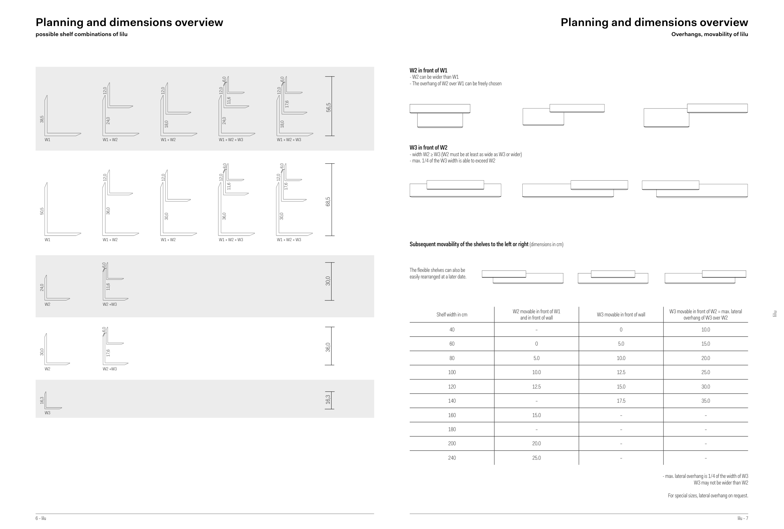 Subsequent movability of the shelves to the left or right (dimensions in cm)