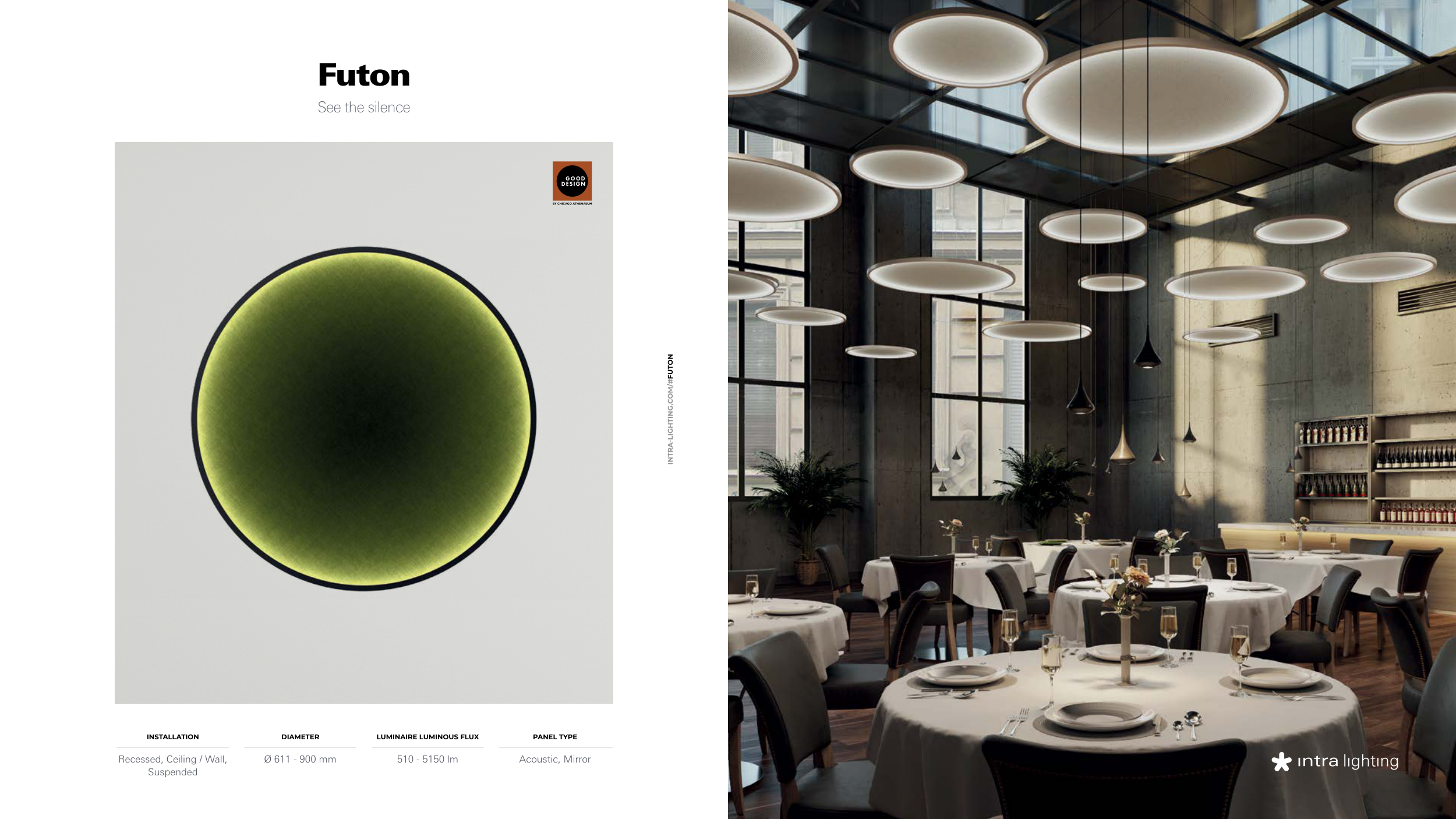 Futon See the silence 510 - 5150 lm LUMINAIRE LUMINOUS FLUX Recessed, Ceiling / Wall, Suspended INSTALLATION Acoustic, Mirror PANEL TYPE Ø 611 - 900 mm DIAMETER INTRA-LIGHTING.COM/#FUTON EXPLORE BACK TO INDEX