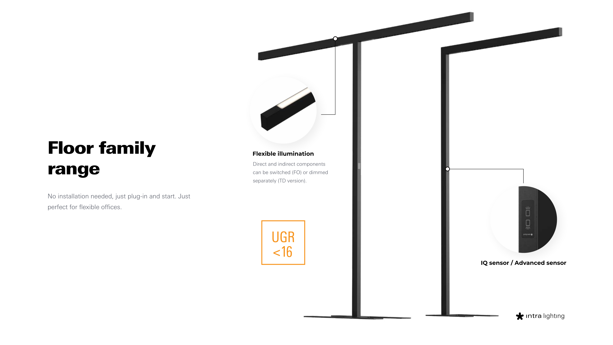 Floor family range IQ sensor / Advanced sensor Flexible illumination No installation needed, just plug-in and start. Just perfect for flexible offices. Direct and indirect components can be switched (FO) or dimmed separately (TD version). BACK TO INDEX