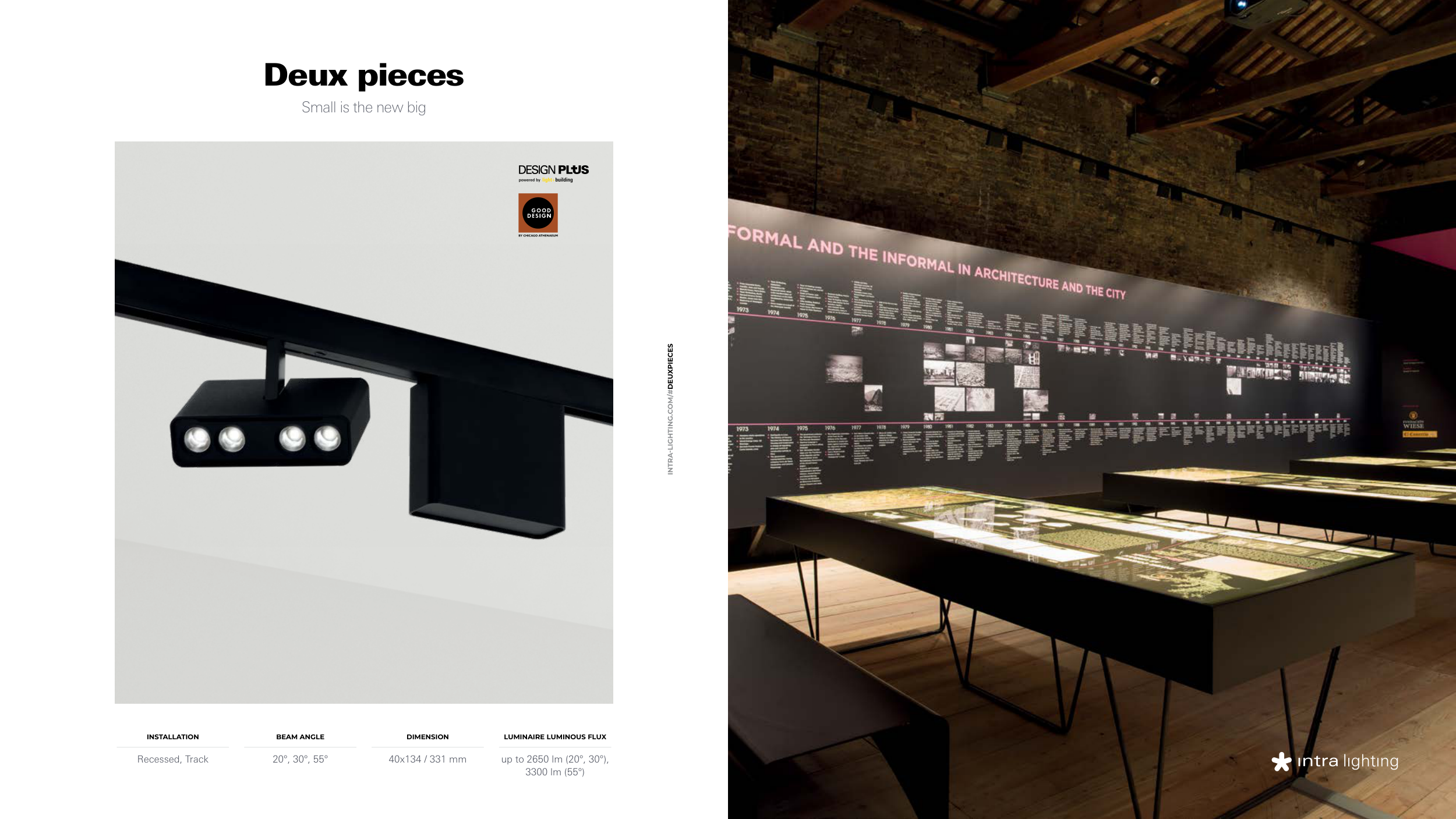 powered by Deux pieces Small is the new big INTRA-LIGHTING.COM/#DEUXPIECES up to 2650 lm (20°, 30°), 3300 lm (55°) LUMINAIRE LUMINOUS FLUX 20°, 30°, 55° BEAM ANGLE 40x134 / 331 mm DIMENSION Recessed, Track INSTALLATION EXPLORE BACK TO INDEX