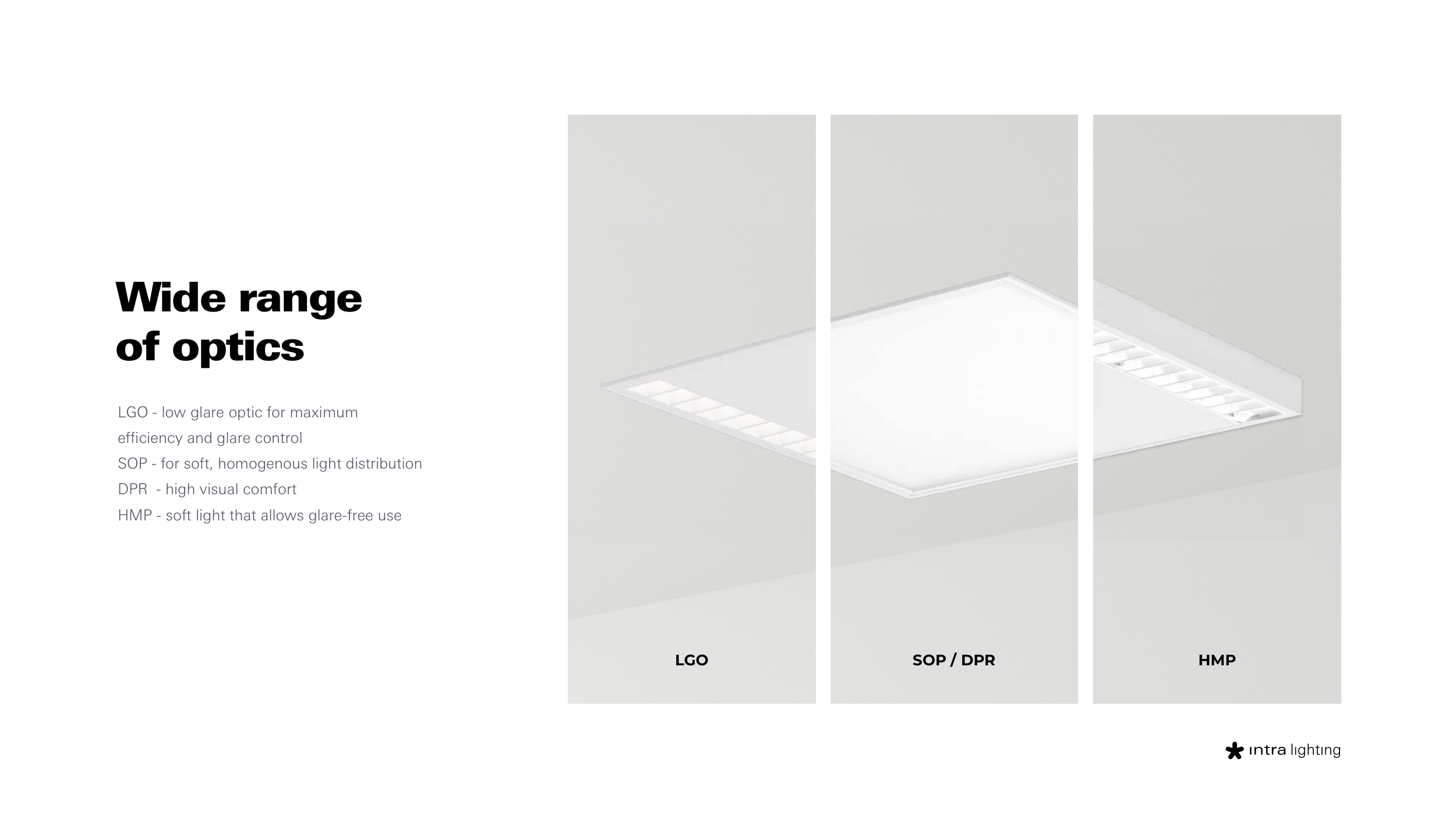 LGO - low glare optic for maximum efficiency and glare control SOP - for soft, homogenous light distribution DPR - high visual comfort HMP - soft light that allows glare-free use Wide range of optics LGO SOP / DPR HMP BACK TO INDEX
