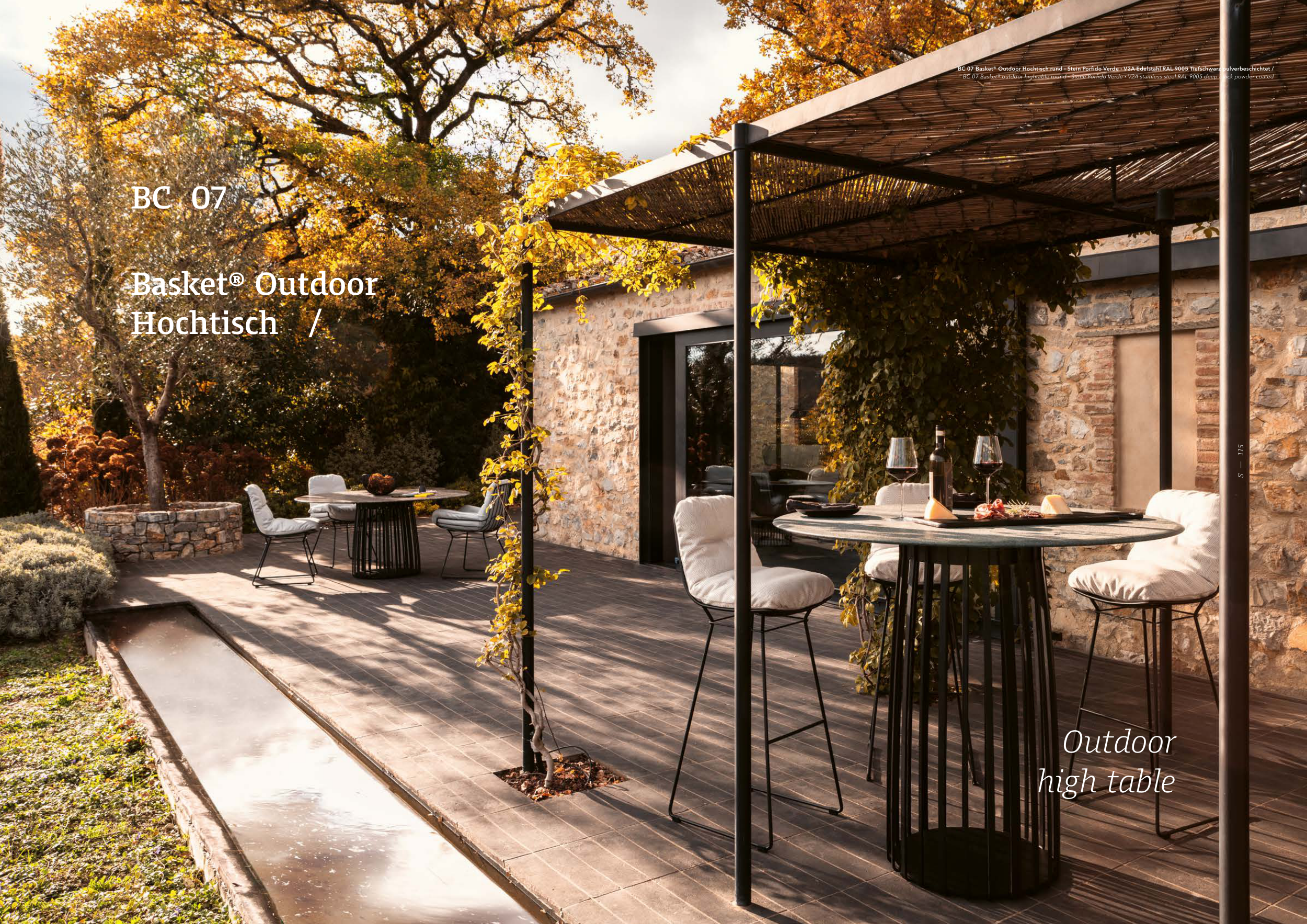BC 07 Basket® Outdoor Hochtisch rund ∙ Stein Porfido Verde ∙ V2A Edelstahl RAL 9005 Tiefschwarz pulverbeschichtet /
