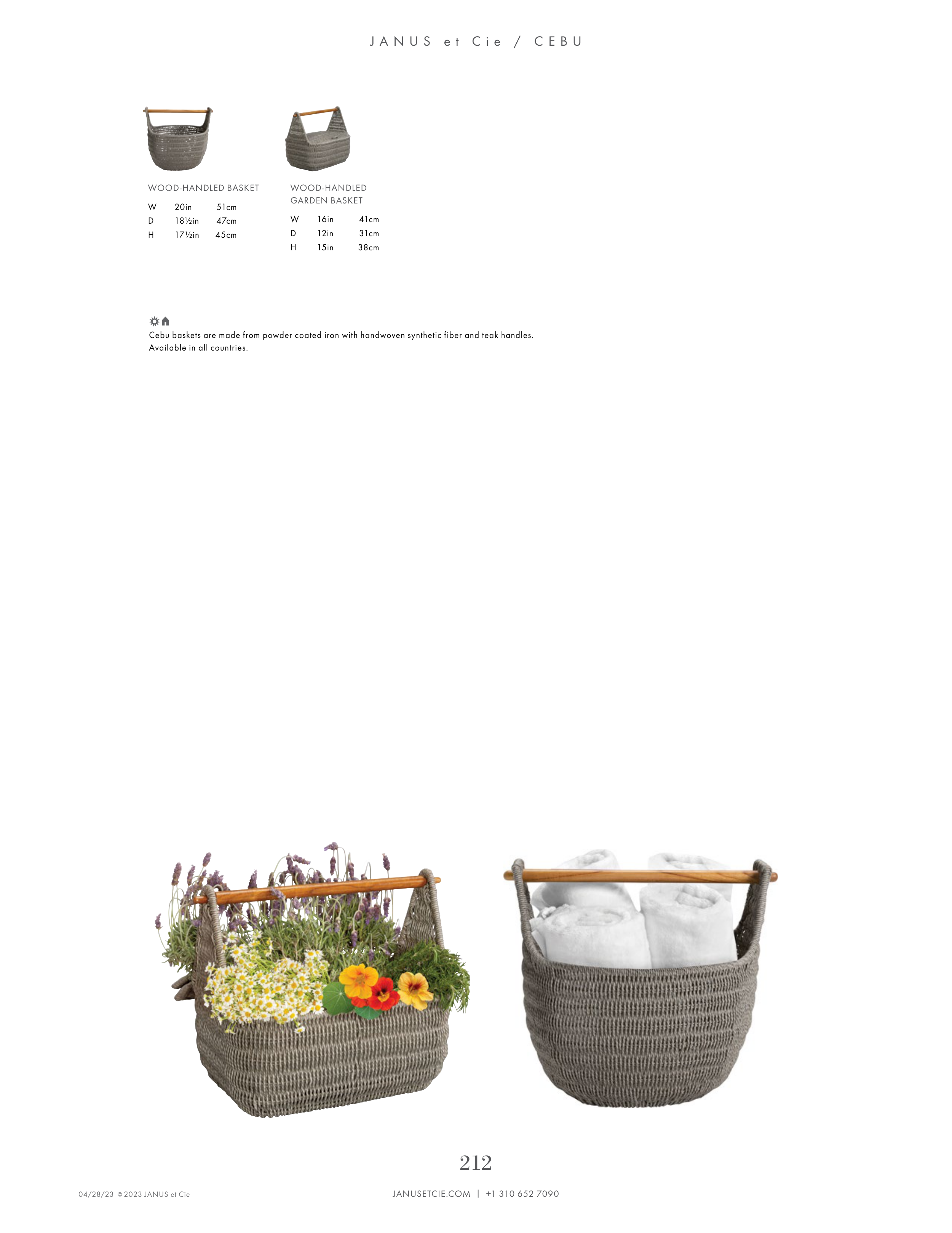 Cebu baskets are made from powder coated iron with handwoven synthetic fiber and teak handles.