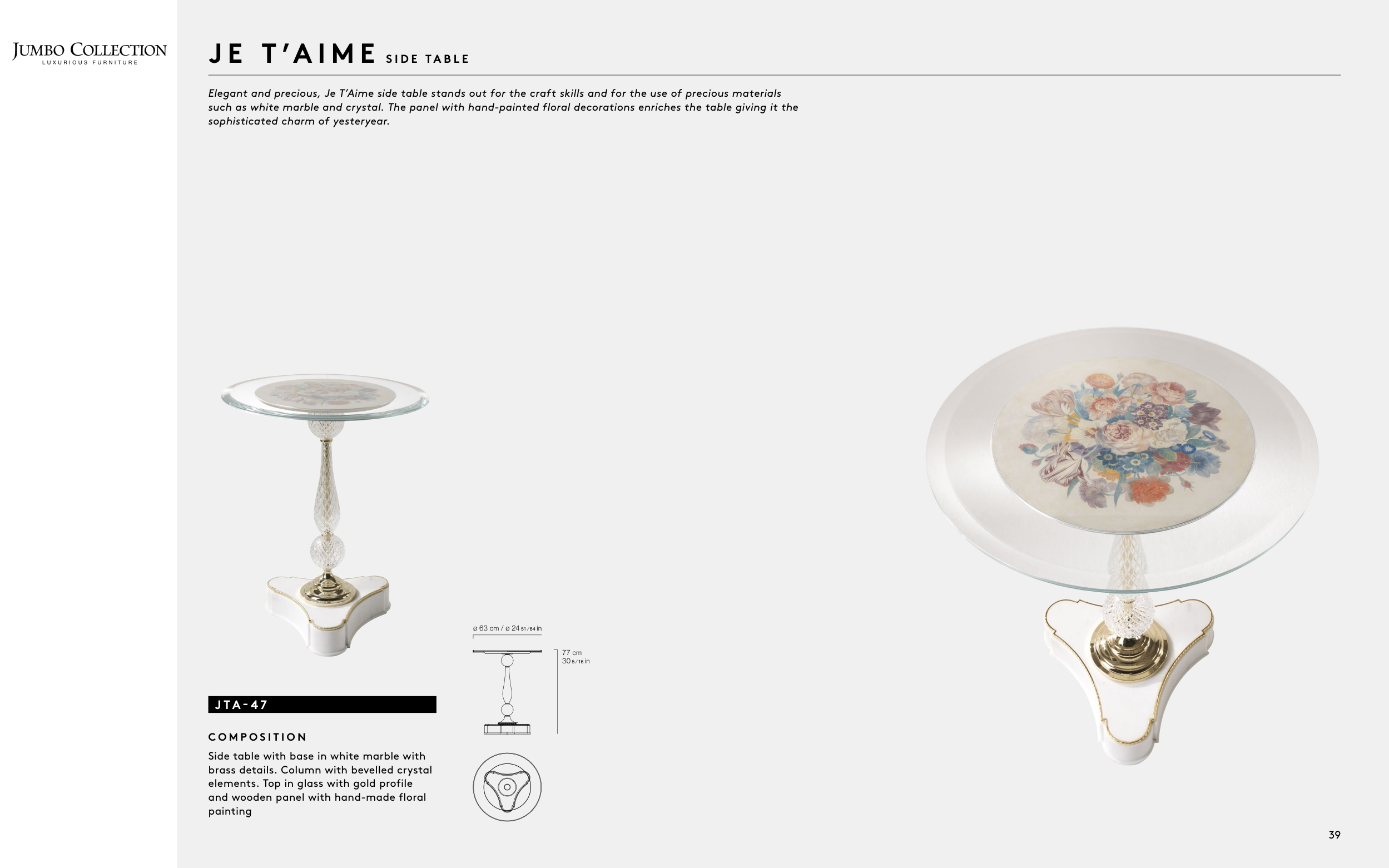 such as white marble and crystal. The panel with hand-painted floral decorations enriches the table giving it the