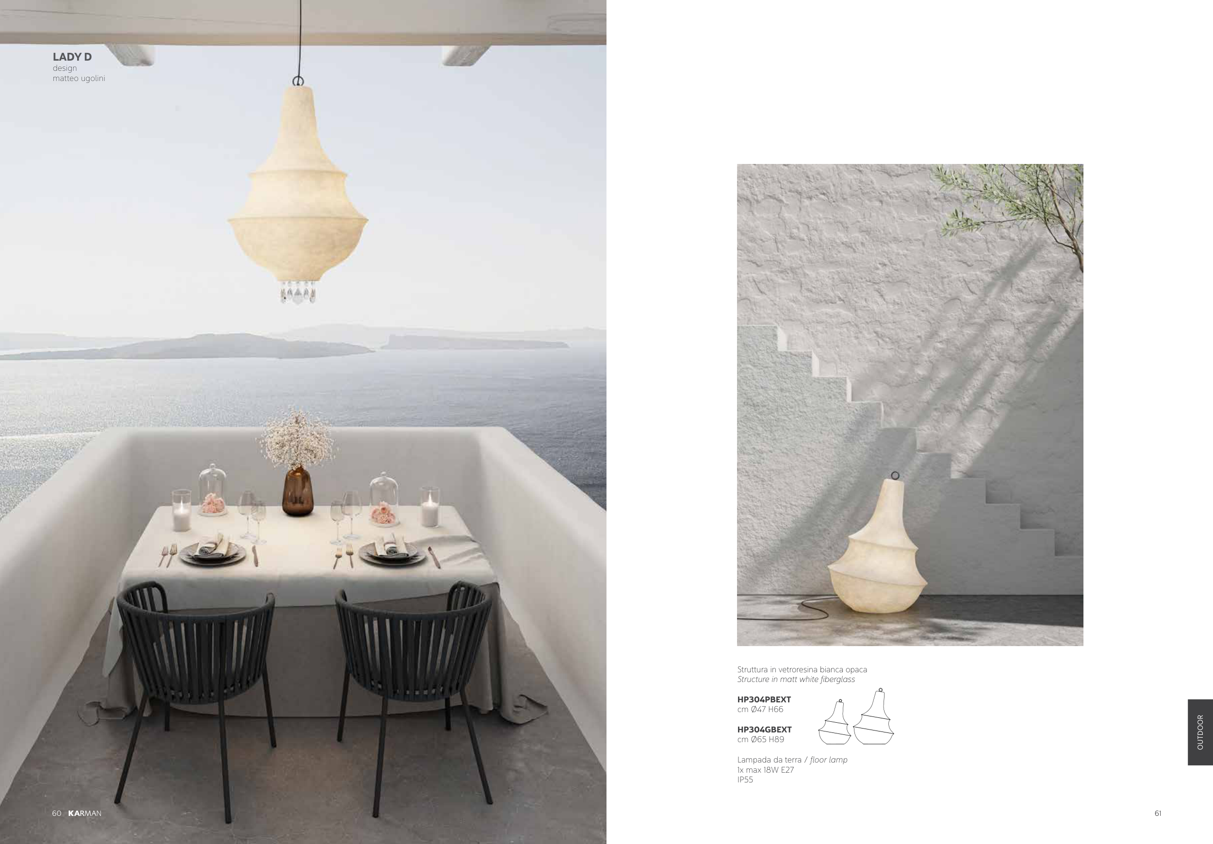 61 OUTDOOR 60 LADY D design matteo ugolini Struttura in vetroresina bianca opaca Structure in matt white fiberglass HP304PBEXT cm Ǿ47 H66 HP304GBEXT cm Ǿ65 H89 Lampada da terra / floor lamp 1x max 18W E27 IP55