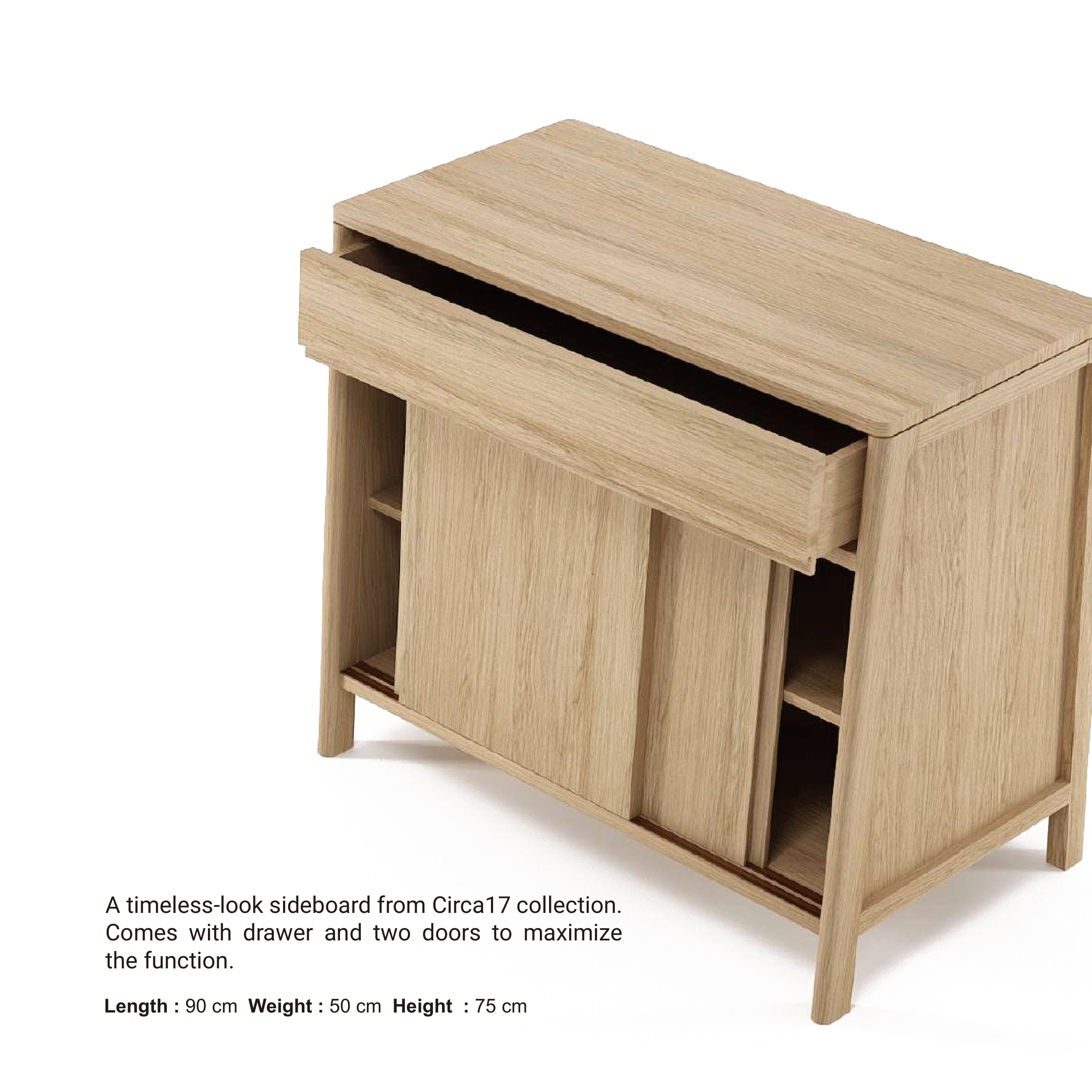 A timeless-look sideboard from Circa17 collection. Comes with drawer and two doors to maximize the function. Length : 90 cm Weight : 50 cm Height : 75 cm