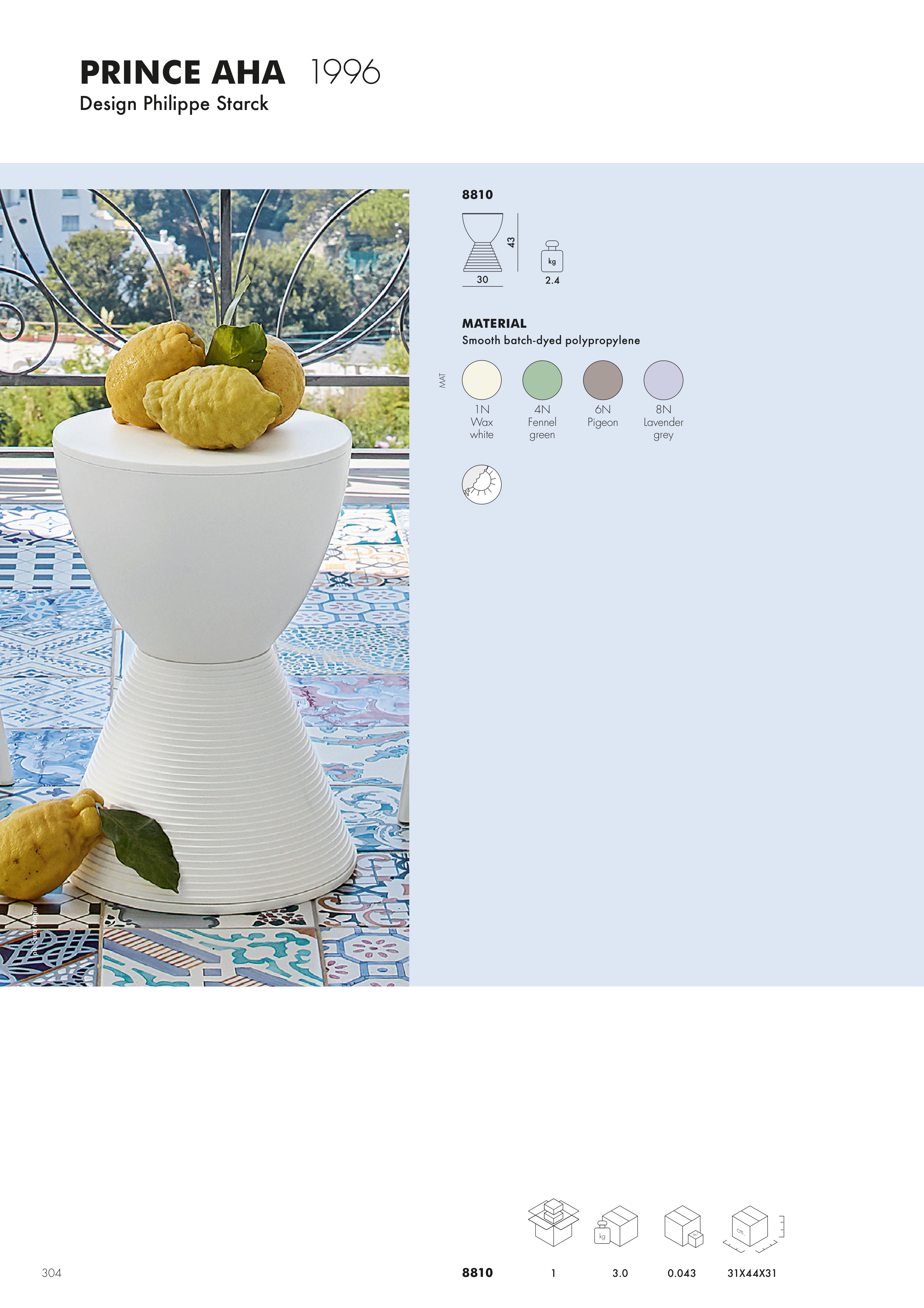 304 PRINCE AHA 1996 Design Philippe Starck ph. Sara Magni kg 2.4 43 30 m3 kg cm. 8810 1 3.0 0.043 31X44X31 1N Wax white 4N Fennel green 6N Pigeon 8N Lavender grey MAT MATERIAL Smooth batch-dyed polypropylene 8810