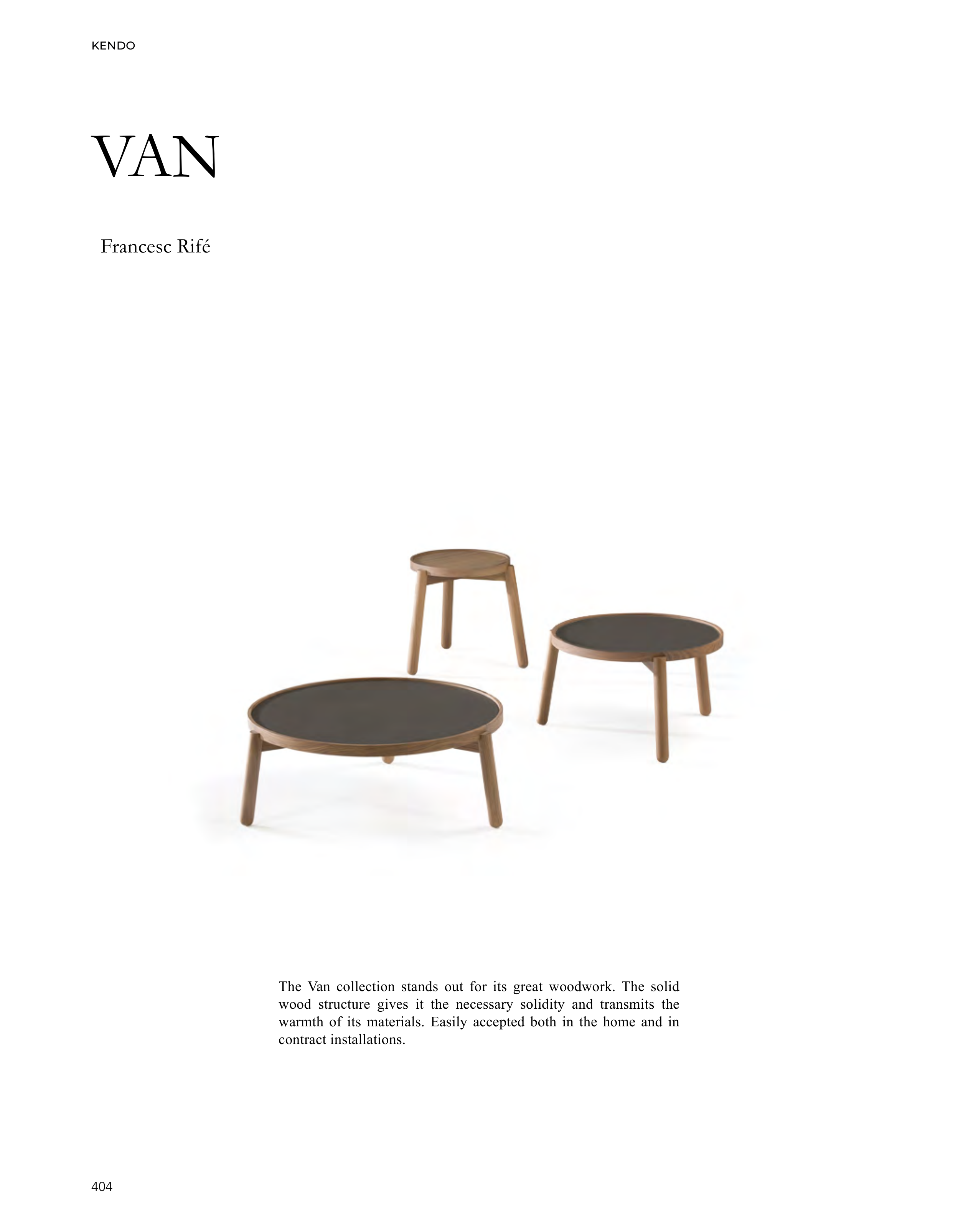 Francesc Rifé KENDO 404 The Van collection stands out for its great woodwork. The solid wood structure gives it the necessary solidity and transmits the warmth of its materials. Easily accepted both in the home and in contract installations. VAN