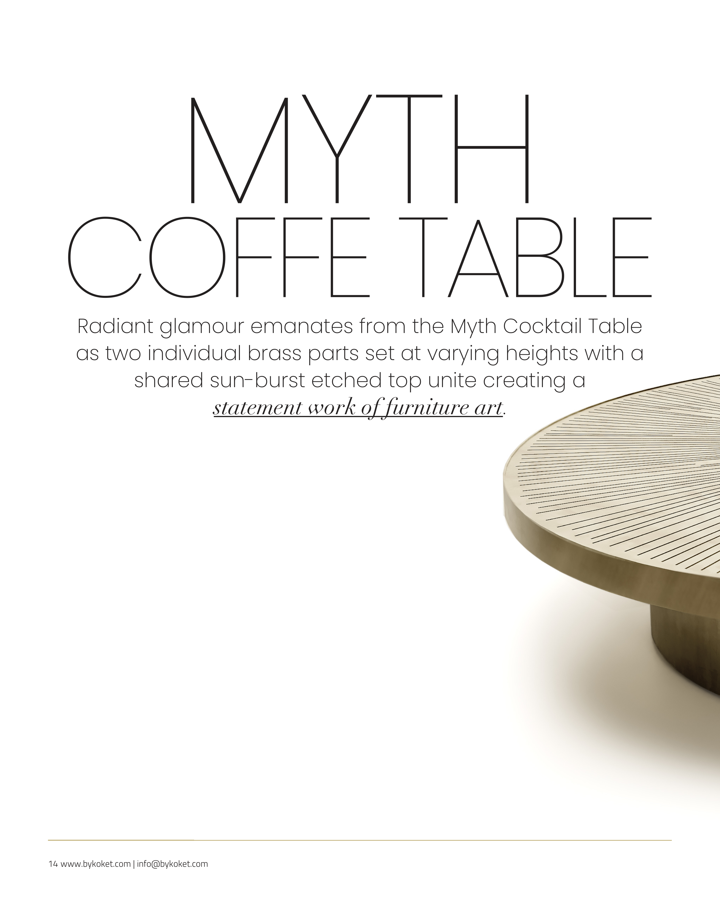 14 www.bykoket.com | info@bykoket.com Radiant glamour emanates from the Myth Cocktail Table as two individual brass parts set at varying heights with a shared sun-burst etched top unite creating a statement work of furniture art.