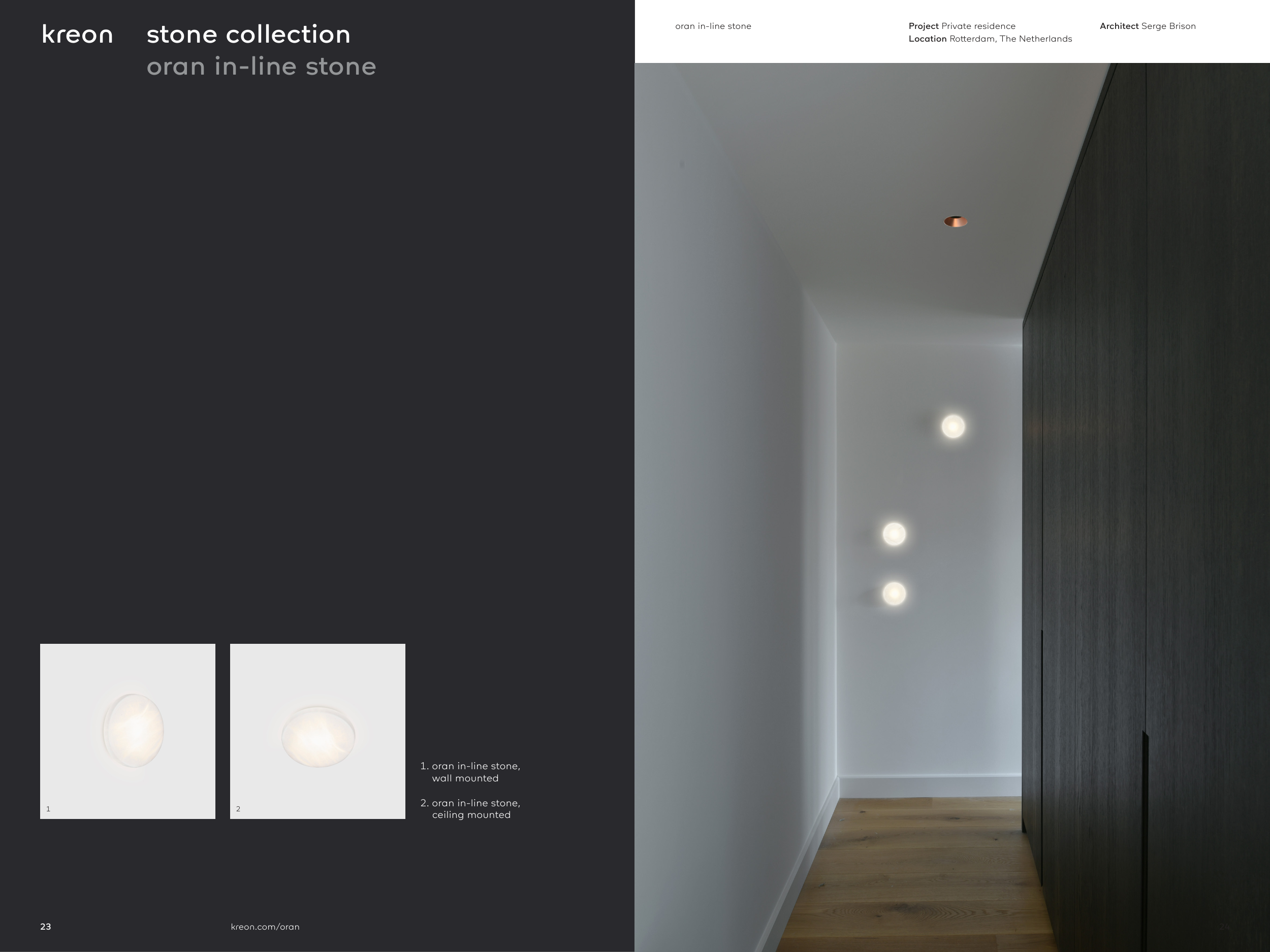 Architect Serge Brison Project Private residence Location Rotterdam, The Netherlands oran in-line stone 1 2 1. oran in-line stone, wall mounted 2. oran in-line stone, ceiling mounted 24 kreon.com/oran 23 kreon stone collection oran in-line stone