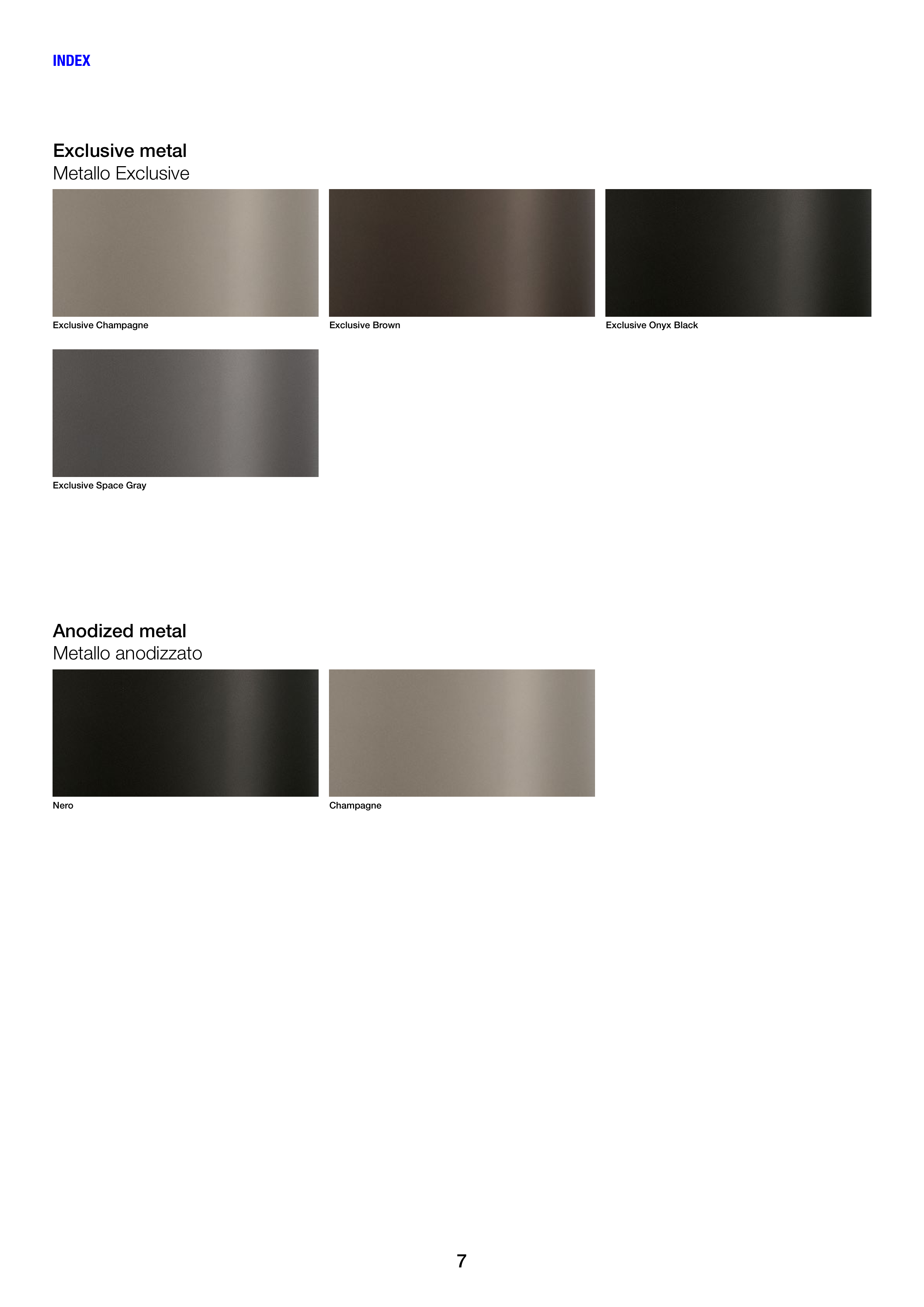 6 7 Nero Exclusive Onyx Black Exclusive Champagne Champagne Exclusive Space Gray Exclusive Brown Exclusive metal Metallo Exclusive Anodized metal Metallo anodizzato INDEX
