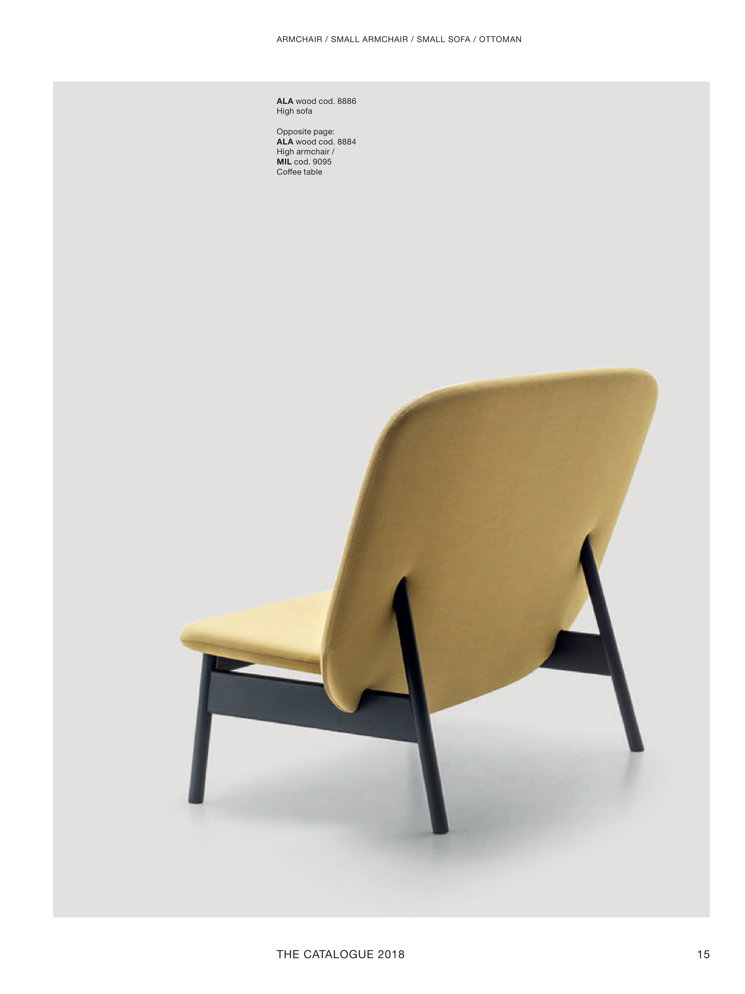 ALA 14 LaCividina THE CATALOGUE 2018 15 ALA wood cod. 8886 High sofa Opposite page: ALA wood cod. 8884 High armchair / MIL cod. 9095 Coffee table ARMCHAIR / SMALL ARMCHAIR / SMALL SOFA / OTTOMAN