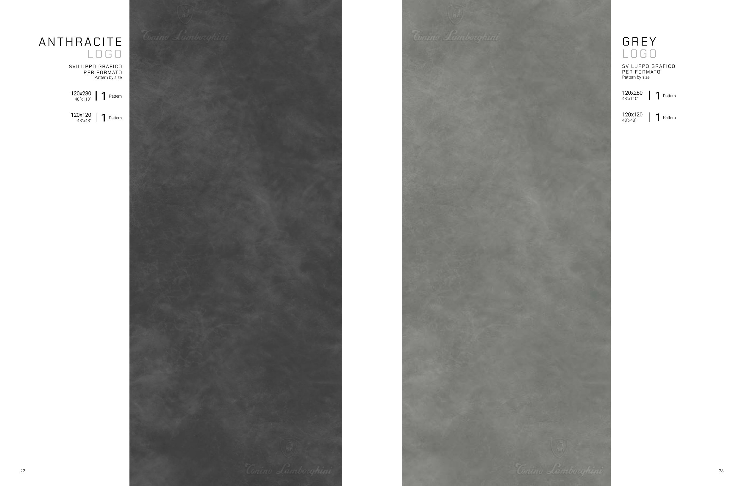 22 23 A N T H R AC IT E LO G O SV I LU P P O G R A F I C O P E R FO RMATO Pattern by size G R EY LOG O SVILUPPO GRAFICO PER FO RMATO Pattern by size 120x280 48”x110” 1 Pattern 120x120 48”x48” 1 Pattern 120x280 48”x110” 1 Pattern 120x120 48”x48” 1 Pattern