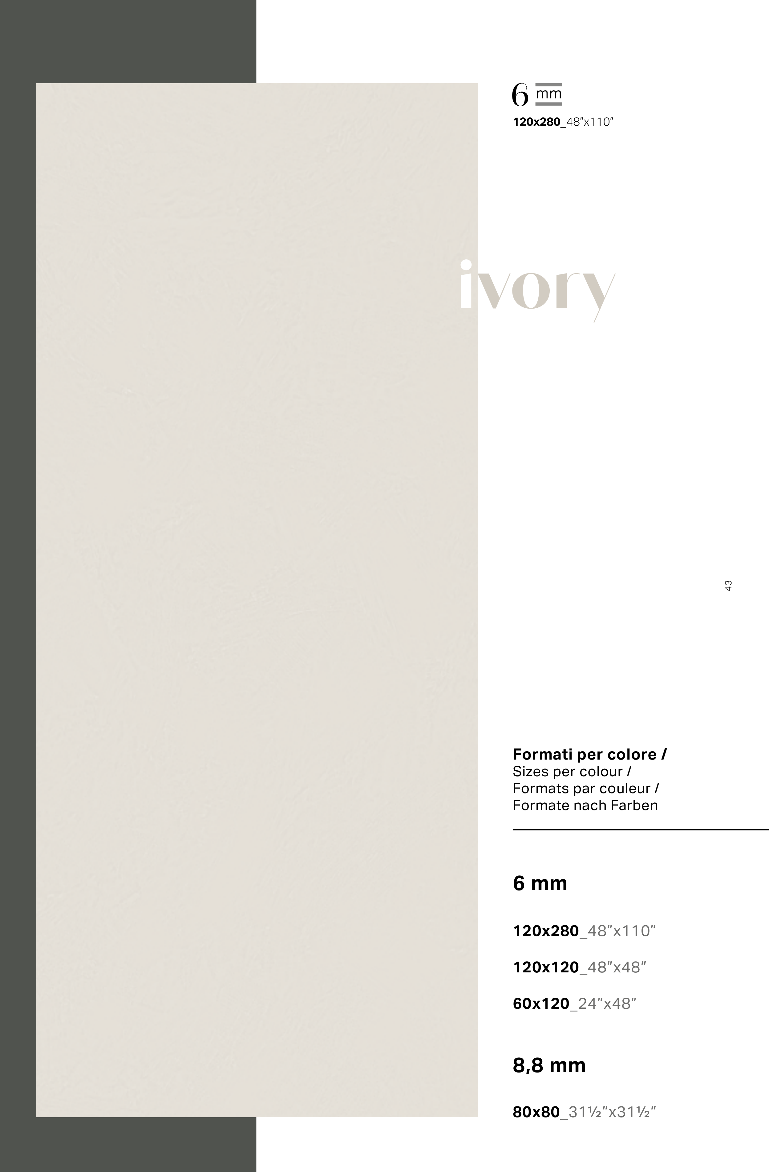 43 ivory 120x280_48”x110” 6 120x280_48”x110” 60x120_24”x48” 120x120_48”x48” 80x80_311/2”x311/2” 8,8 mm 6 mm Formati per colore / Sizes per colour / Formats par couleur / Formate nach Farben