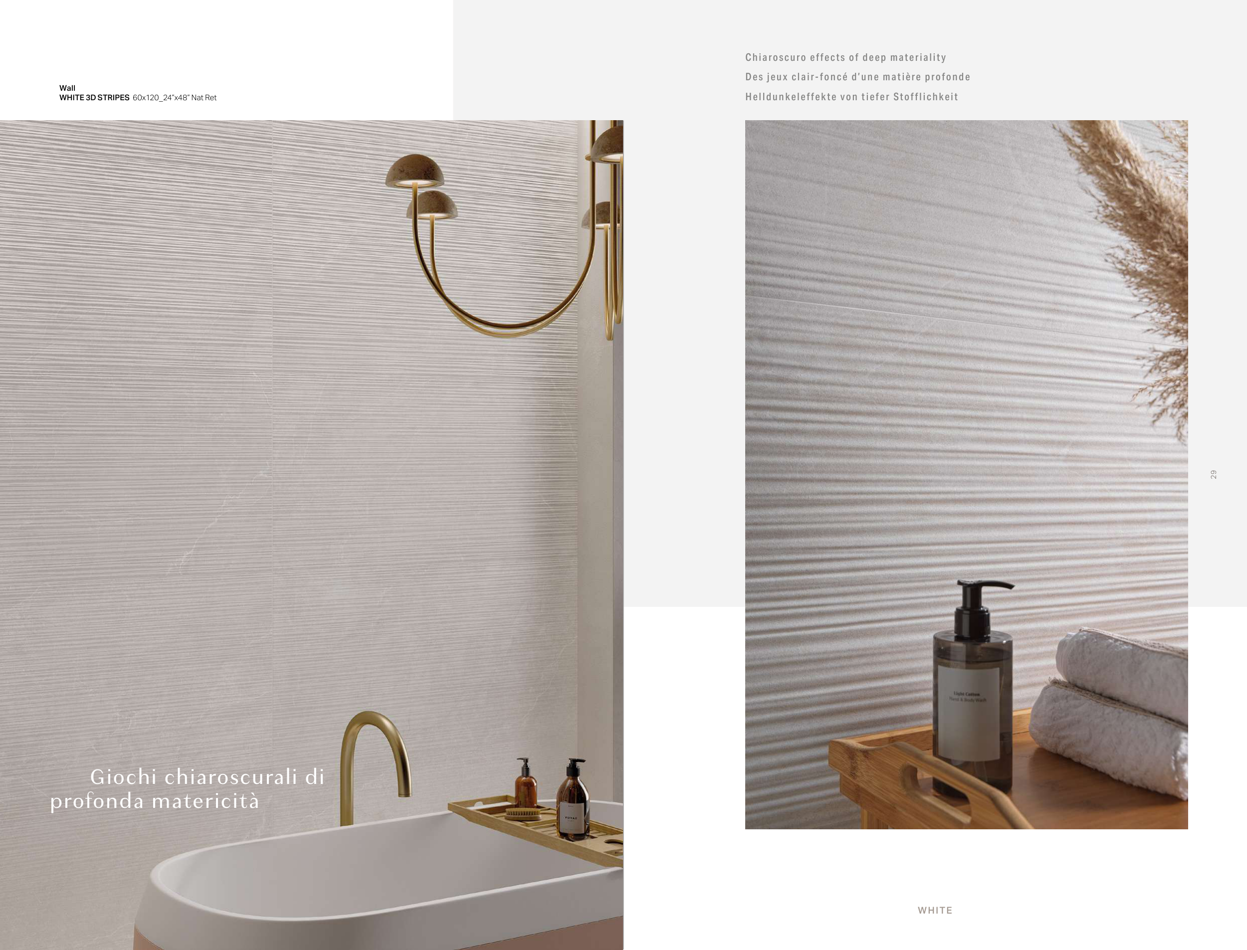 28 29 Wall WHITE 3D STRIPES 60x120_24”x48” Nat Ret Giochi chiaroscurali di profonda matericità Chiaroscuro effects of deep materiality Des jeux clair- foncé d’une matière profonde Helldunkeleffekte von tiefer Stofflichkeit WHITE