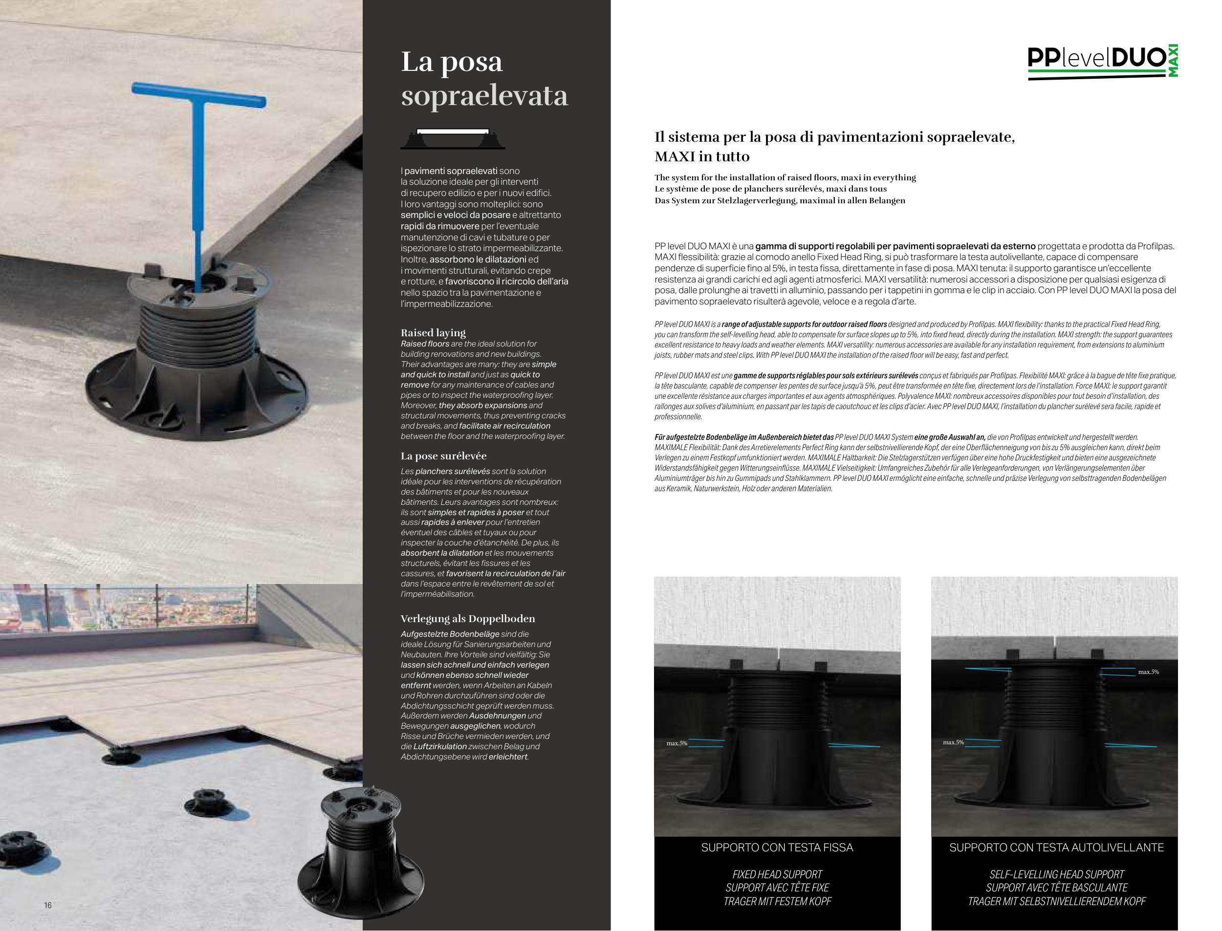 PP level DUO MAXI è una gamma di supporti regolabili per pavimenti sopraelevati da esterno progettata e prodotta da Profilpas.