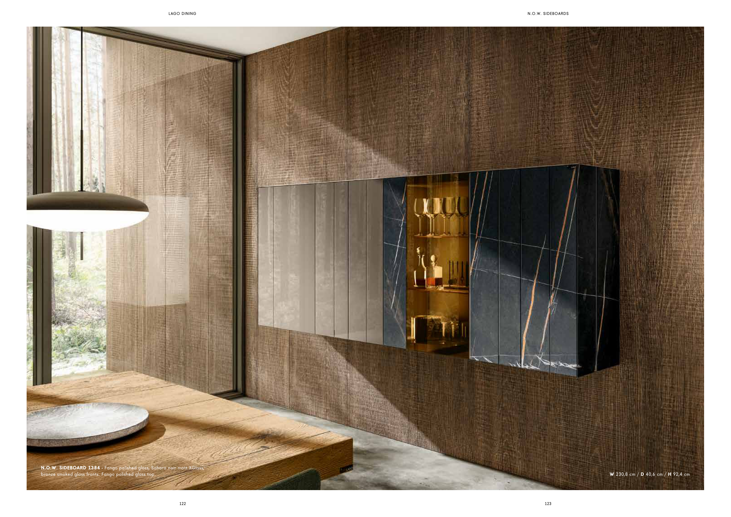 LAGO DINING 122 123 W 230,8 cm / D 40,6 cm / H 92,4 cm N.O.W. SIDEBOARDS N.O.W. SIDEBOARD 1384 - Fango polished glass, Sahara noir matt XGlass, bronze smoked glass fronts. Fango polished glass top.