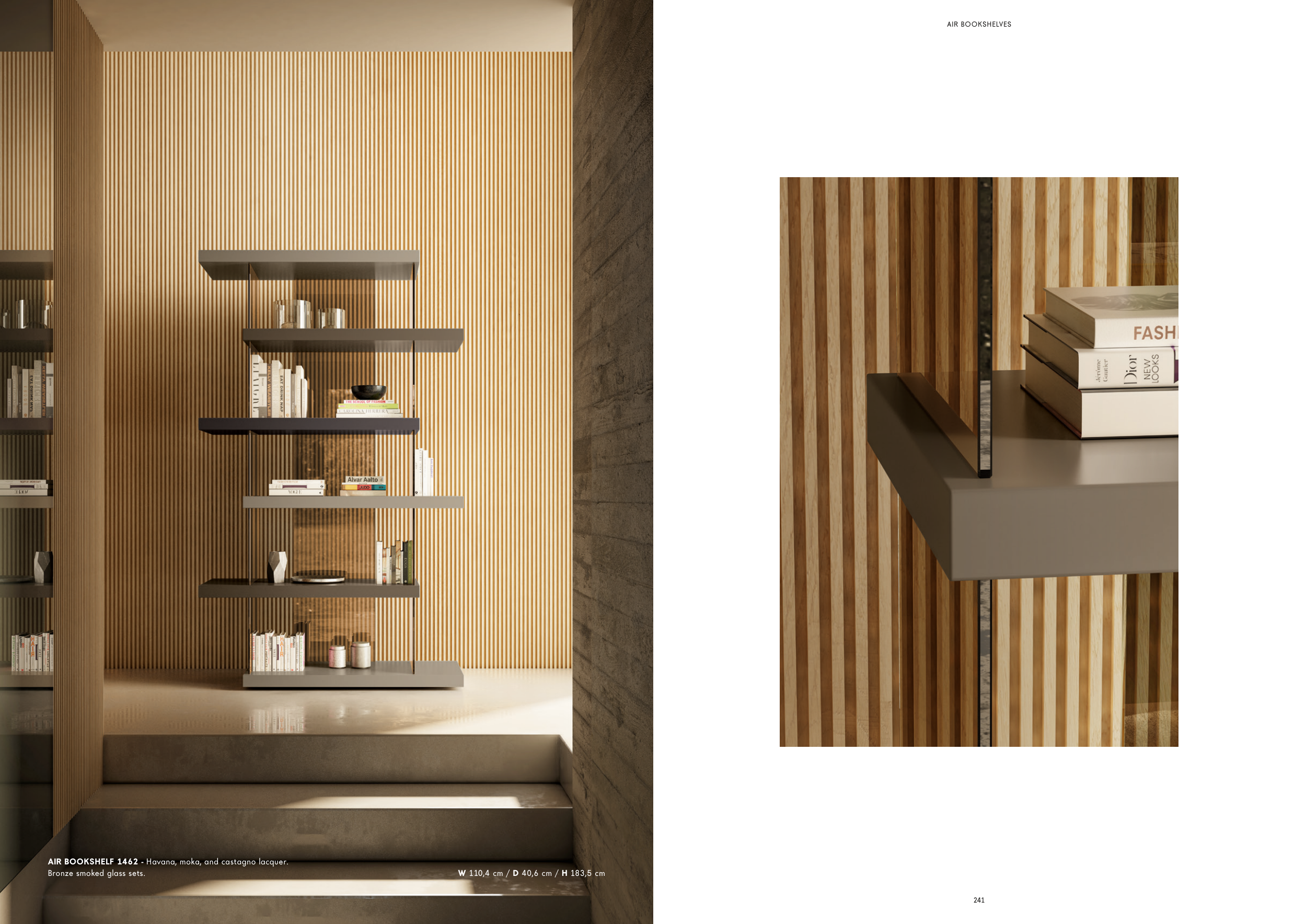 LAGO LIVING 240 241 AIR BOOKSHELF 1462 - Havana, moka, and castagno lacquer. Bronze smoked glass sets. W 110,4 cm / D 40,6 cm / H 183,5 cm AIR BOOKSHELVES